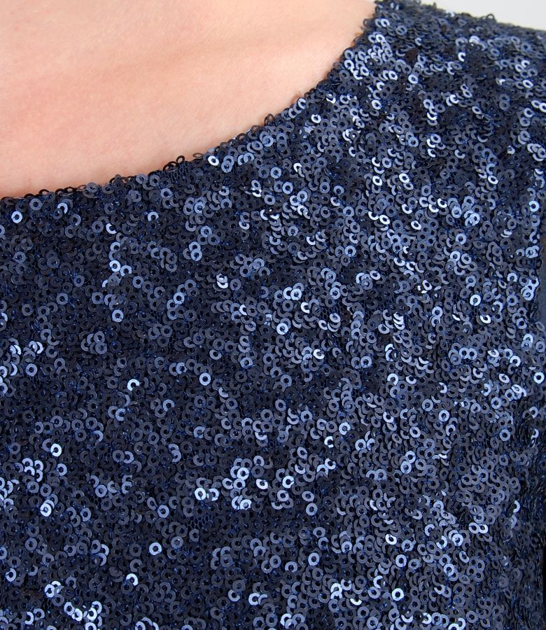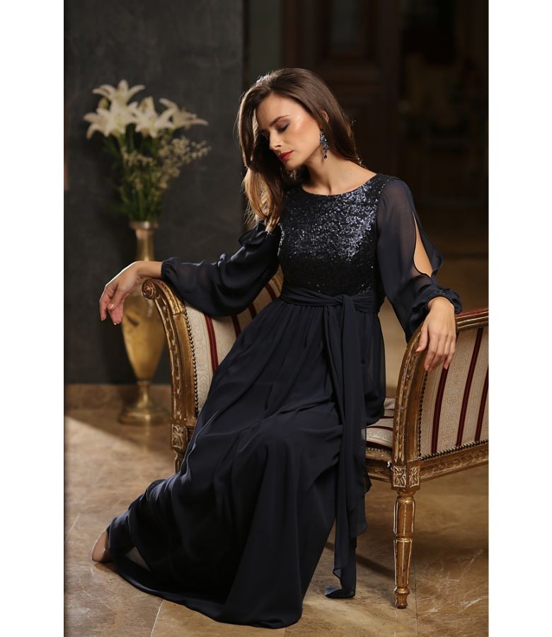 Rochie de seara din voal, cu corsaj din paiete mici bleumarin lucios, dublata cu saten in ton. Maneci lungi din voal, deschise pe lateral, cu terminatie elastica. Se strange in talie cu un cordon de voal. Se inchide cu fermoar ascuns pe lateral stanga.