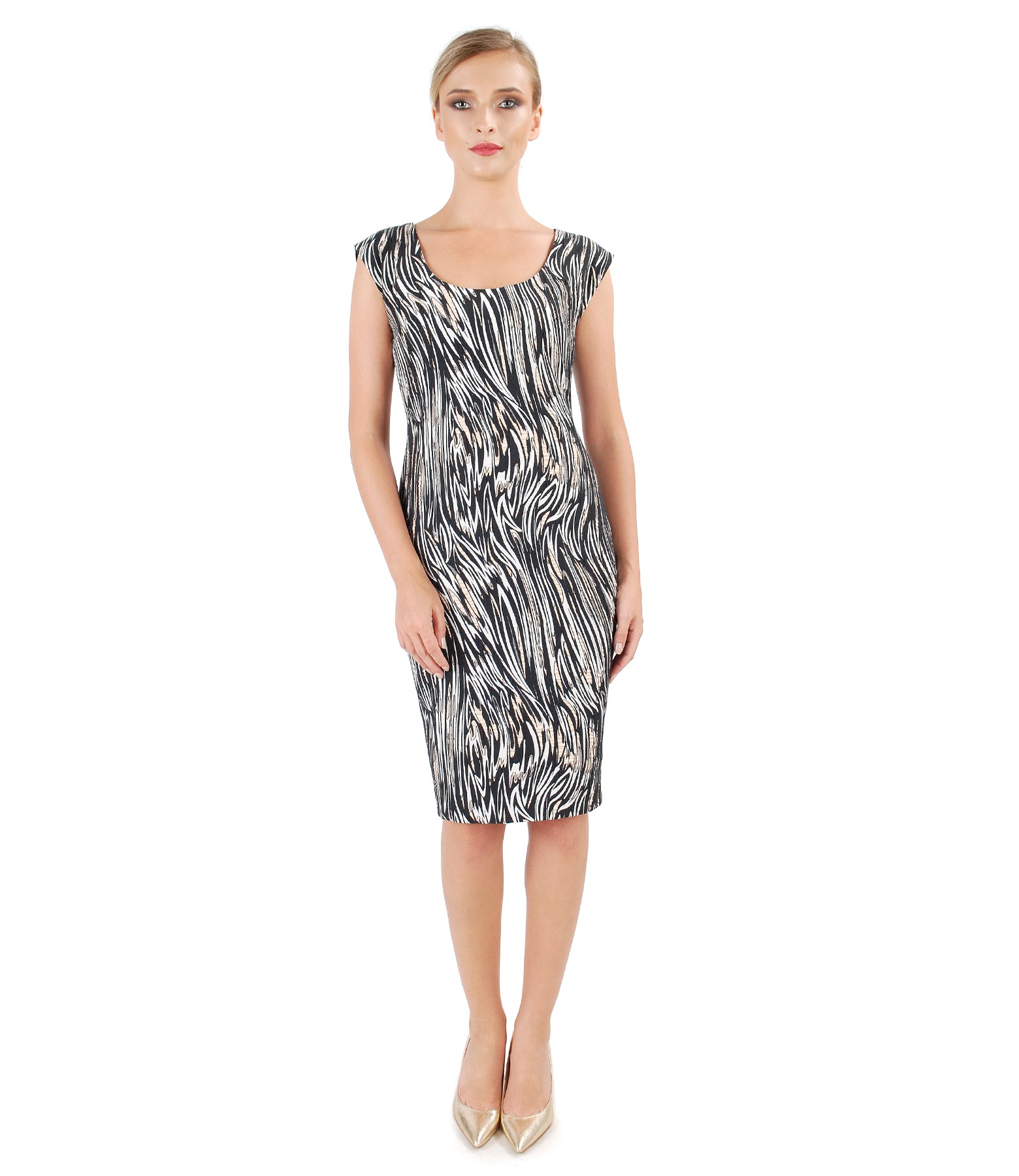 Rochie din brocart elastic de bumbac, cu fir metalic auriu, captusita, cu decolteu rotund si maneci cazute. Se inchide cu fermoar ascuns pe lateral stanga.