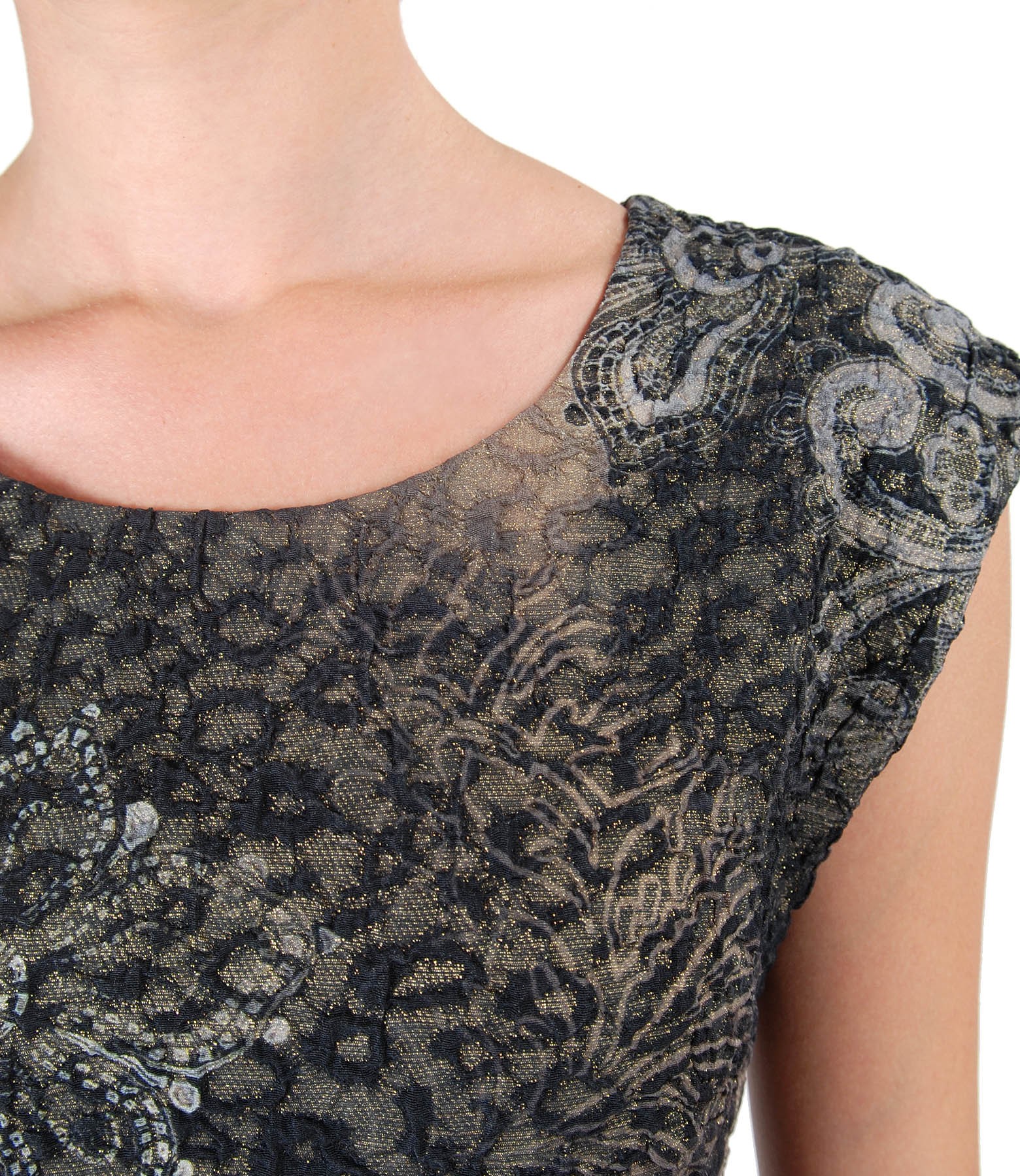 Rochie eleganta din brocart elastic cu fir de efect metalic auriu, captusita, cu maneci cazute si decolteu rotund. Se inchide cu fermoar ascuns pe mijloc spate. Pozitia imprimeului variaza per produs.