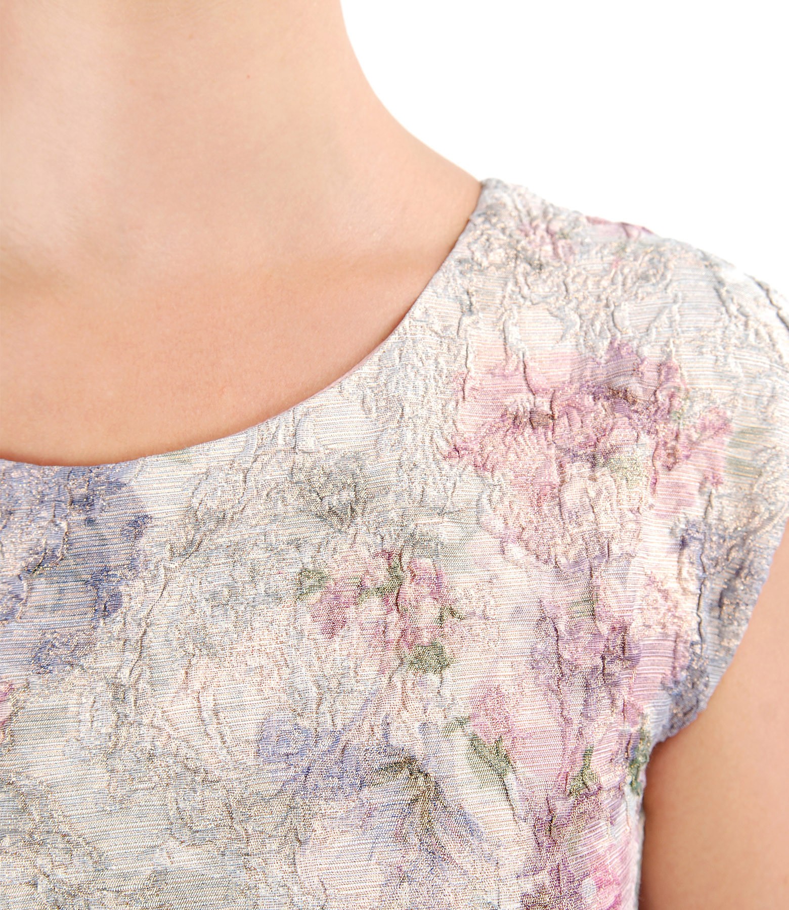 Rochie eleganta din brocart elastic cu fir de efect metalic auriu, necaptusita, cu maneci cazute si decolteu rotund. Se inchide cu fermoar ascuns pe mijloc spate. Pozitia imprimeului variaza per produs.