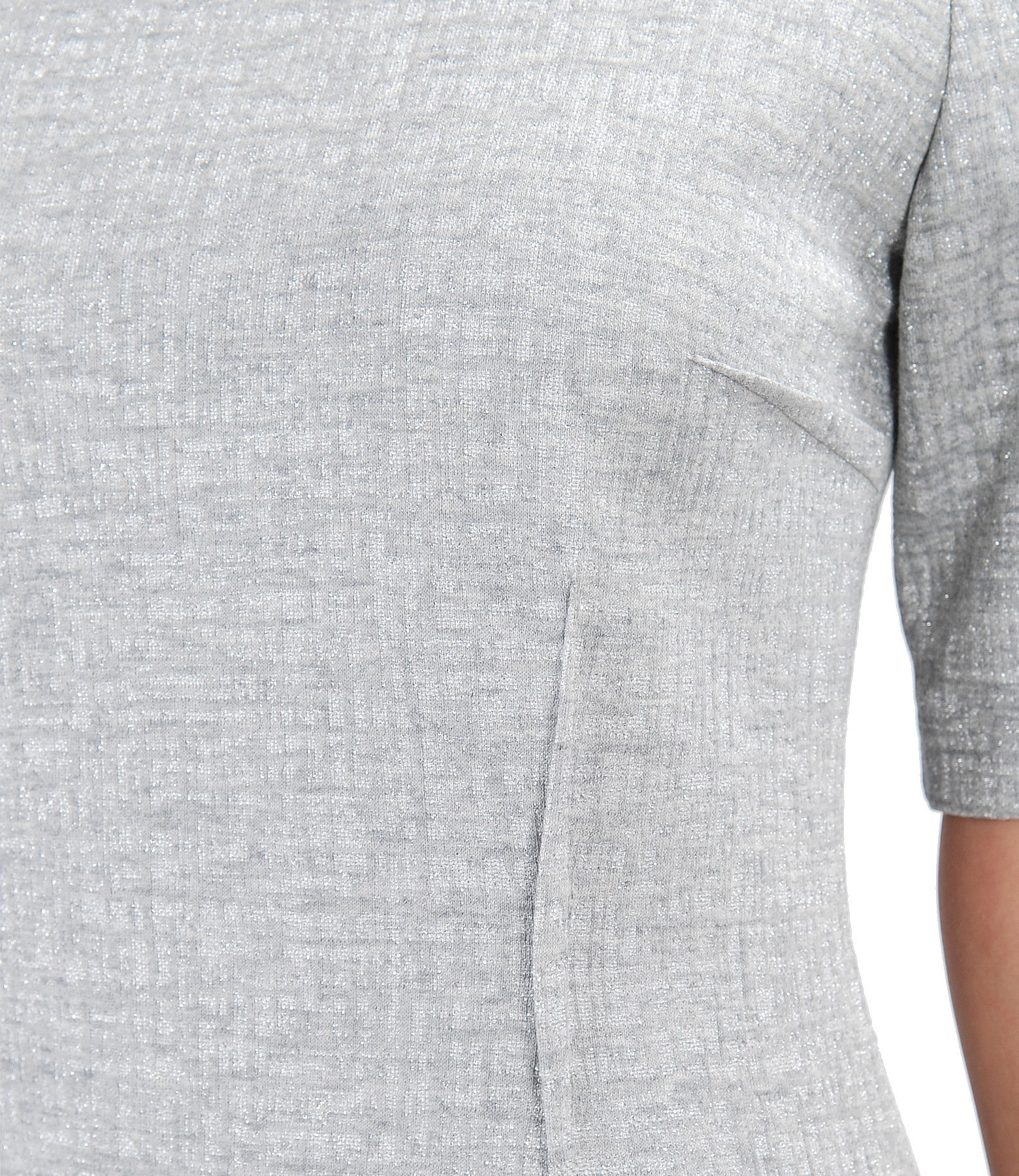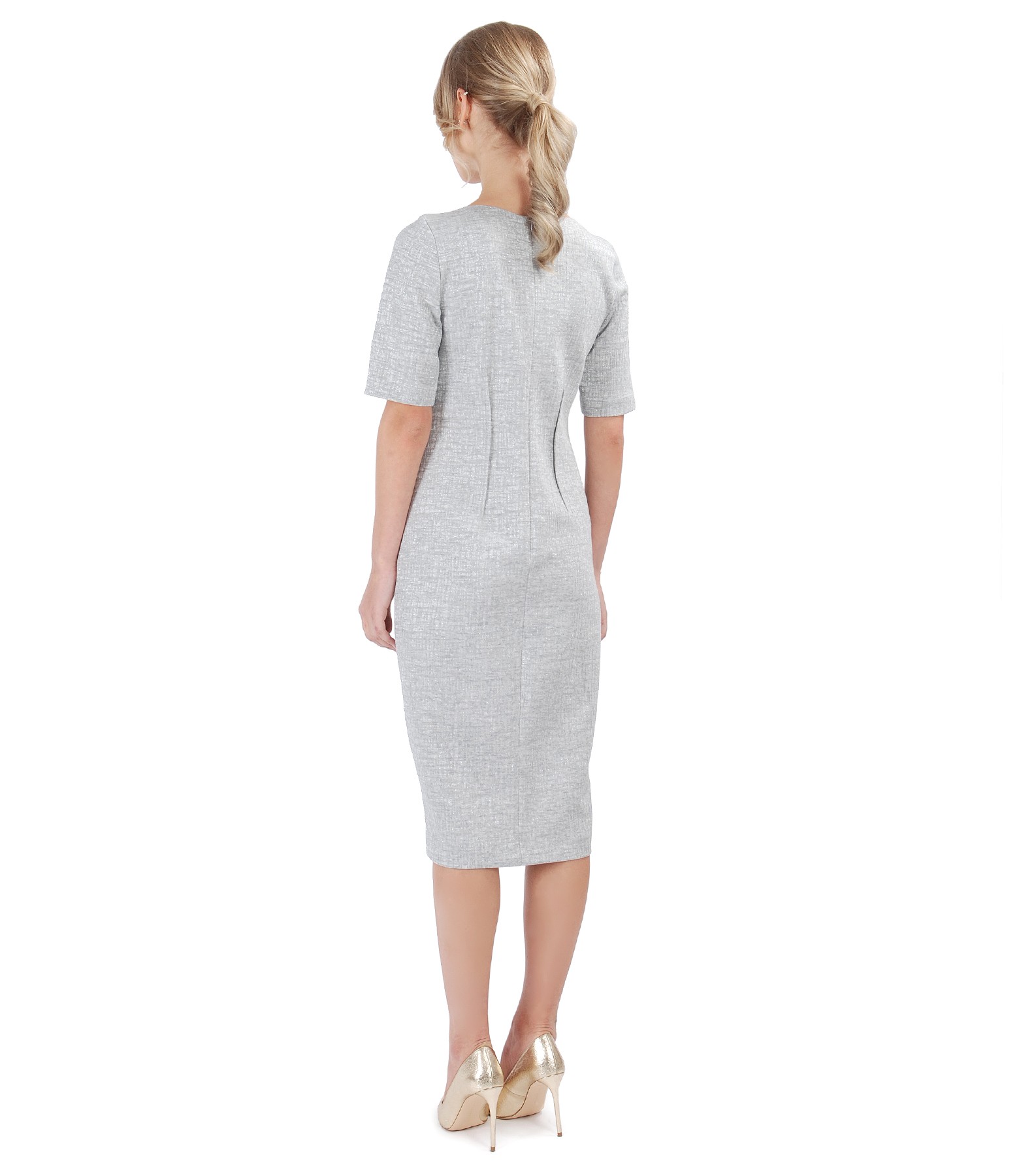 Rochie dreapta din bumbac cu fir de efect argintiu, necaptusita, cu decolteu rotund, maneci scurte si aplicatie de cristale pe decolteu. Se inchide cu fermoar ascuns pe mijloc spate.