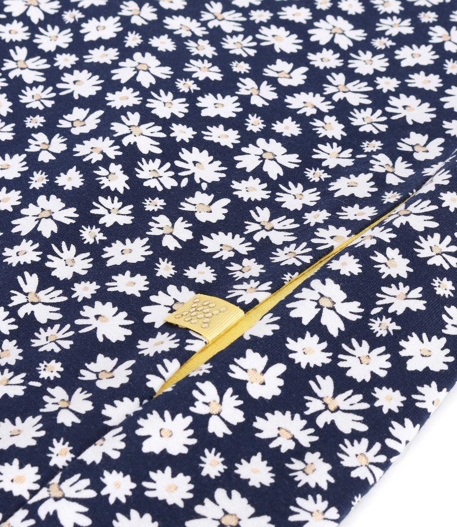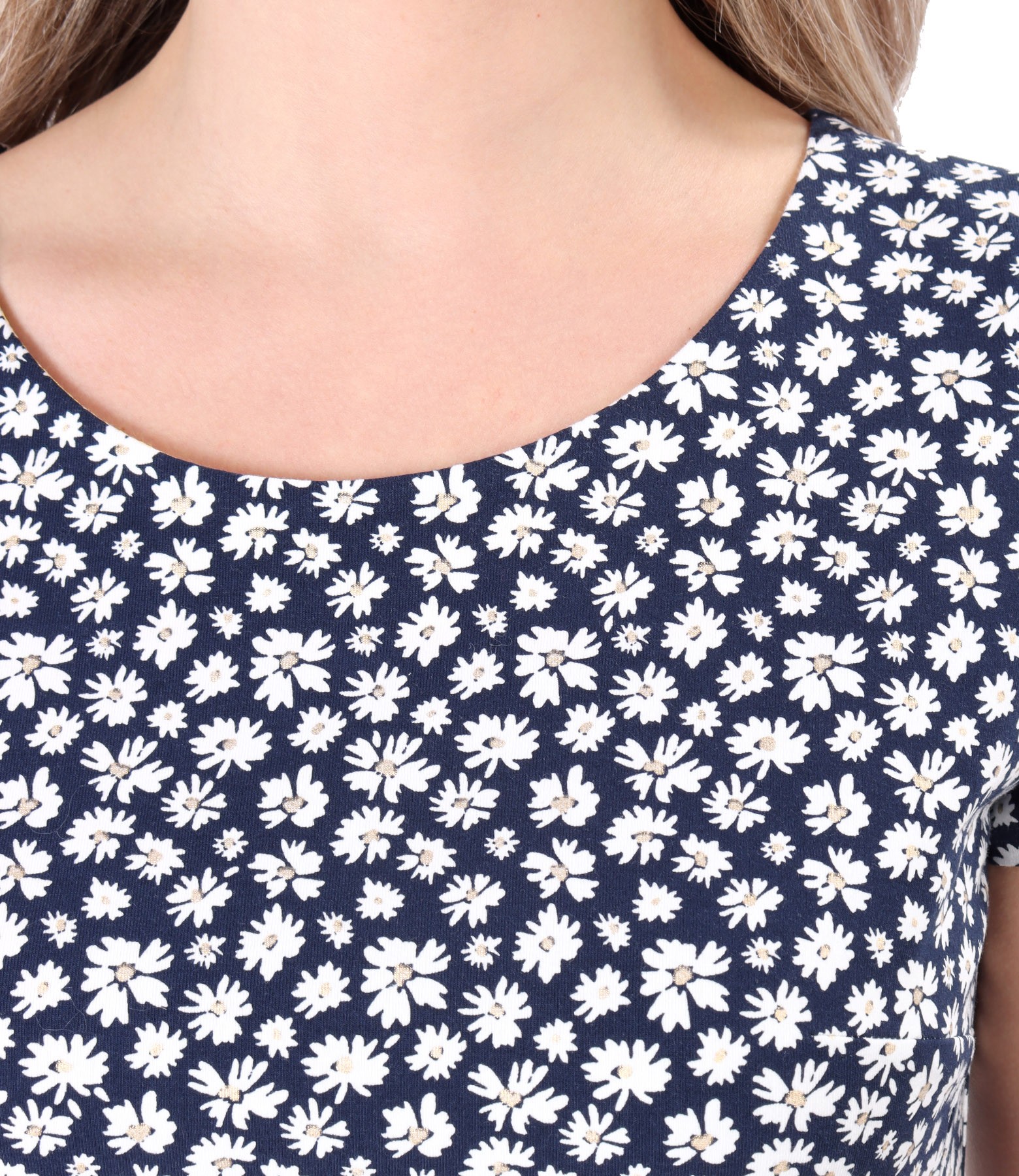 Rochie din bumbac elastic, imprimat cu motive florale decorate cu accente aurii, necaptusita, cu maneci scurte, decolteu rotund si buzunare laterale.