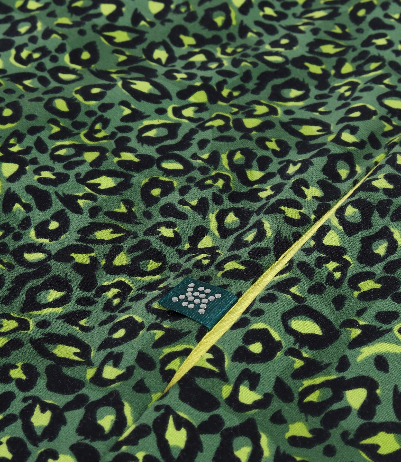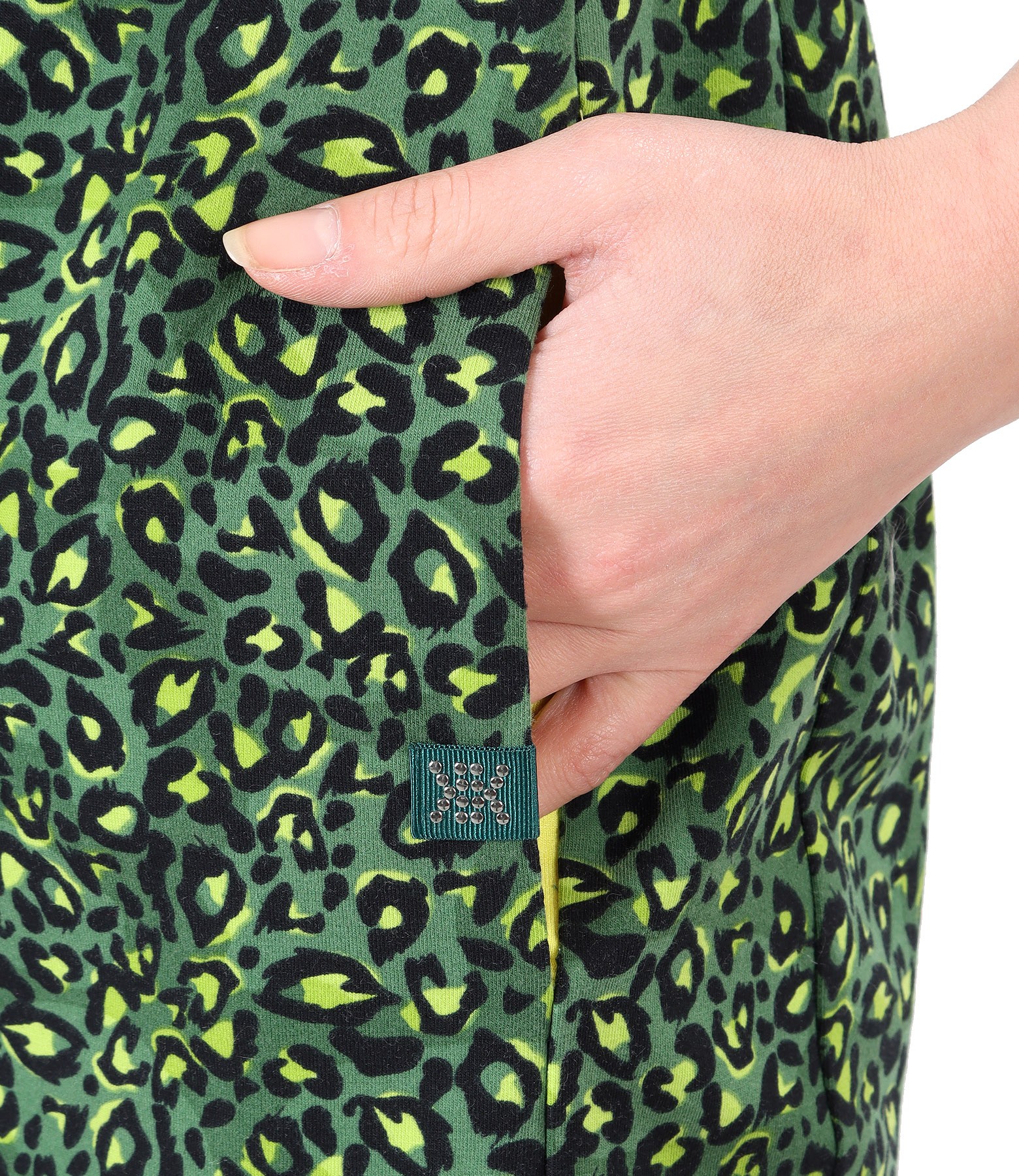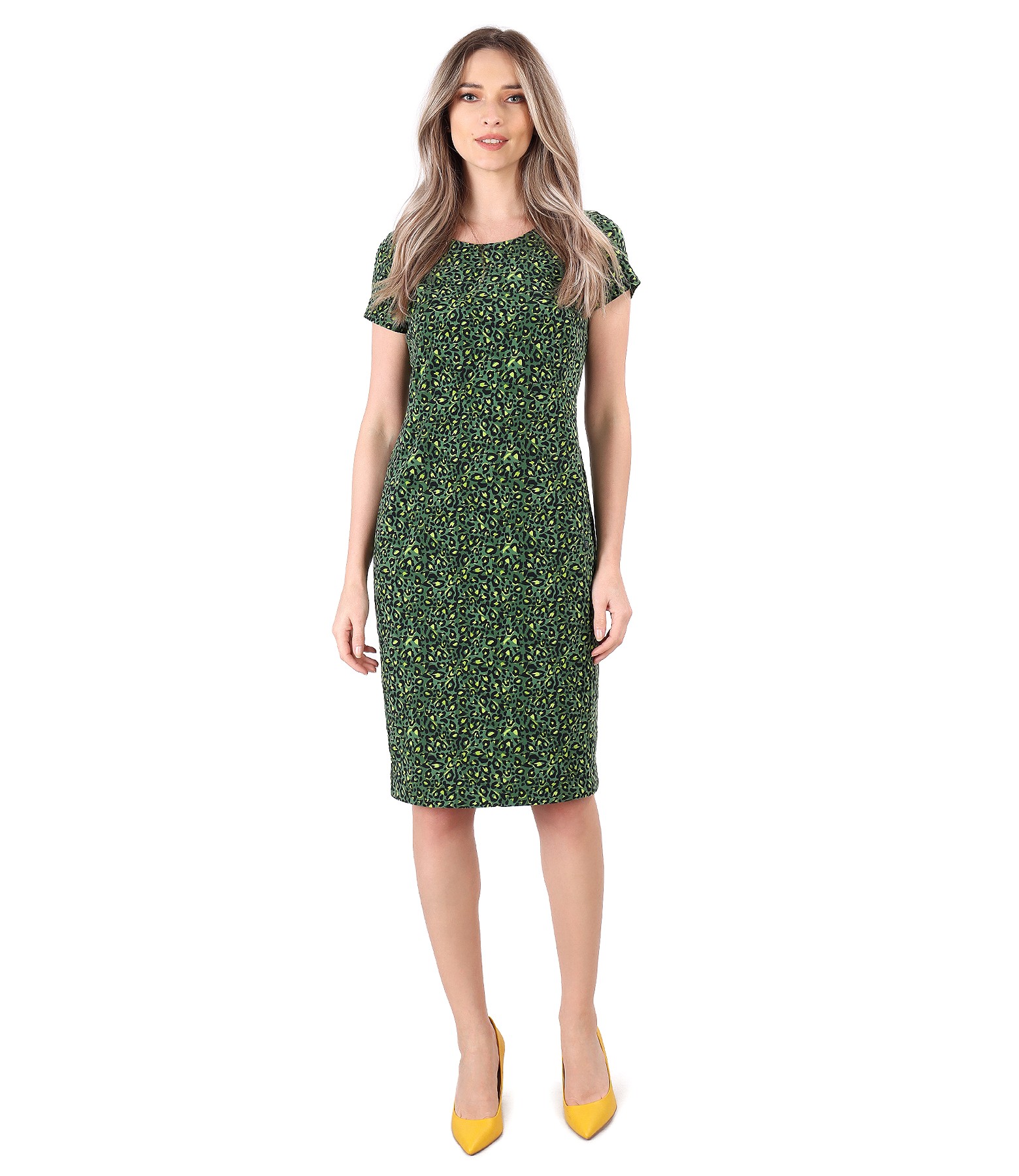 Rochie din bumbac elastic imprimat, necaptusita, cu maneci scurte, decolteu rotund si buzunare laterale.