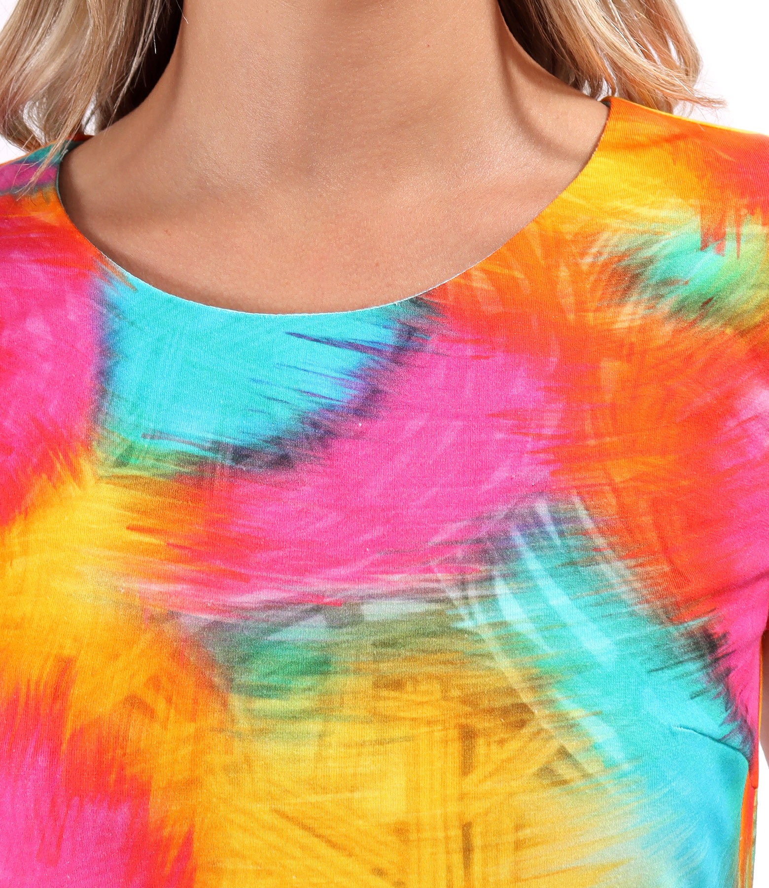 Rochie din bumbac elastic imprimat, necaptusita, cu maneci scurte, decolteu rotund si buzunare laterale.