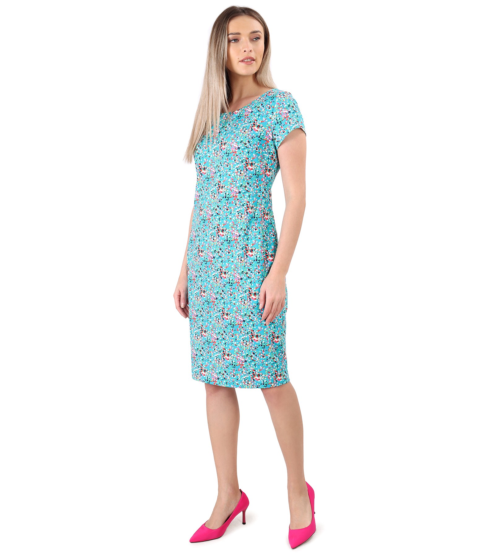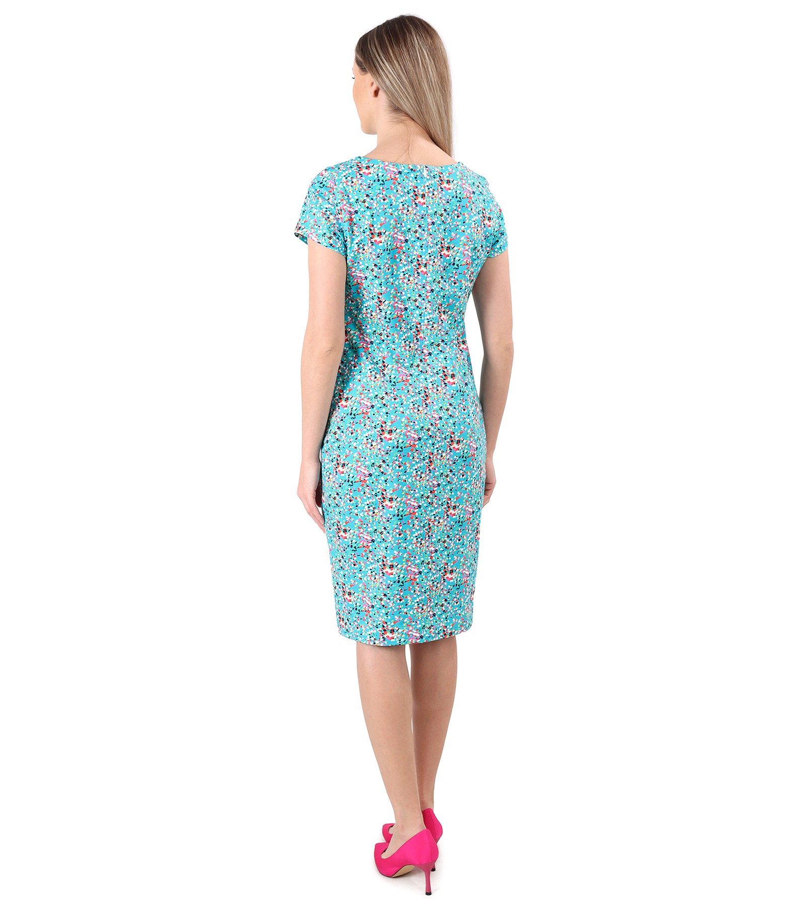 Rochie din bumbac elastic, imprimat cu motive florale, necaptusita, cu maneci scurte, decolteu rotund si buzunare laterale.