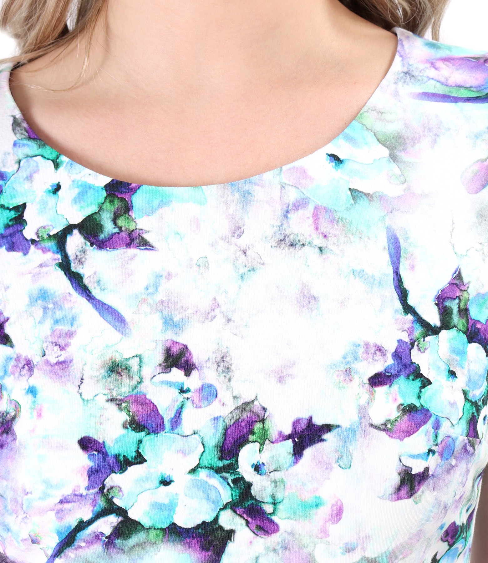 Rochie din bumbac elastic, imprimat cu motive florale, necaptusita, cu maneci scurte, decolteu rotund si buzunare laterale.