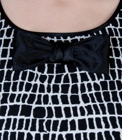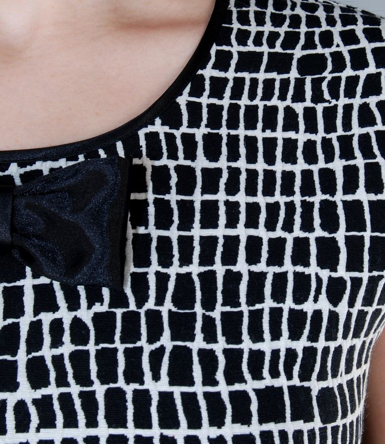 Rochie din bumbac elastic gofrat alb-negru, cu decolteu rotund si umeri cazuti. Accesoriu papion detasabil de saten, lucrat manual. Se inchide cu fermoar ascuns pe mijloc spate.