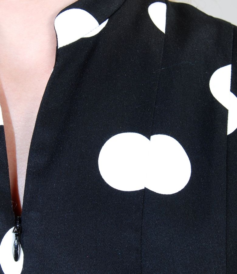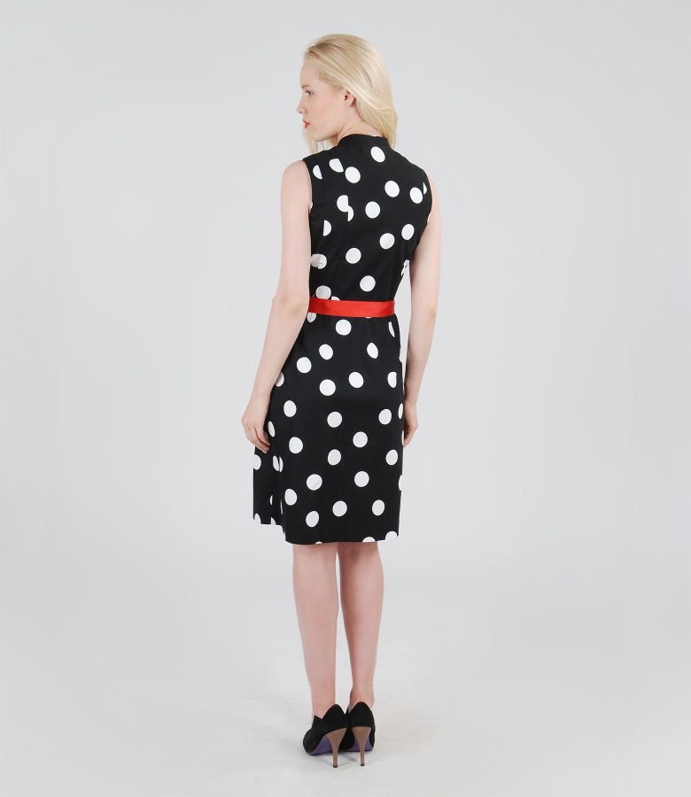 Rochie din bumbac elastic imprimat, cu guler gen tunica, fara maneci. Fusta evazata cu pliuri, slit fals pe fata si buzunare laterale. Se inchide cu fermoar ascuns pe mijloc fata. Se strange cu un cordon detasabil de rips in talie.