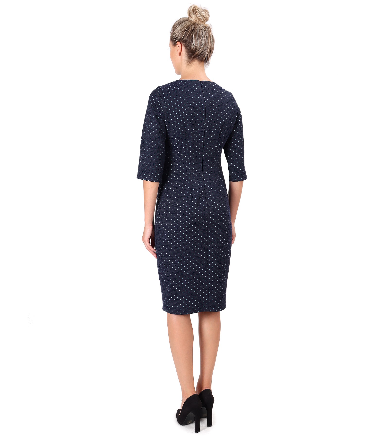 Rochie midi din bumbac gros brocat, necaptusita, cu maneci 3/4, guler rotund cu garnitura din catifea si cu aplicatie de cristale. Se inchide cu fermoar ascuns pe mijloc spate.