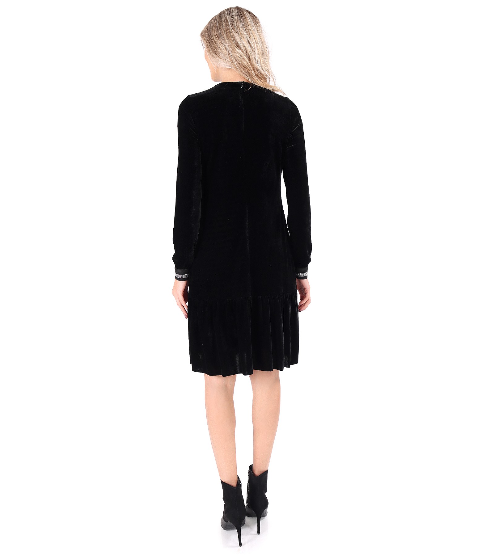 Rochie din catifea, cu volan la teminatie, maneci lungi incretite cu elastic cu cristale, decolteu rotund si aplicatie de cristale in talie. Se inchide cu fermoar ascuns pe mijloc spate.