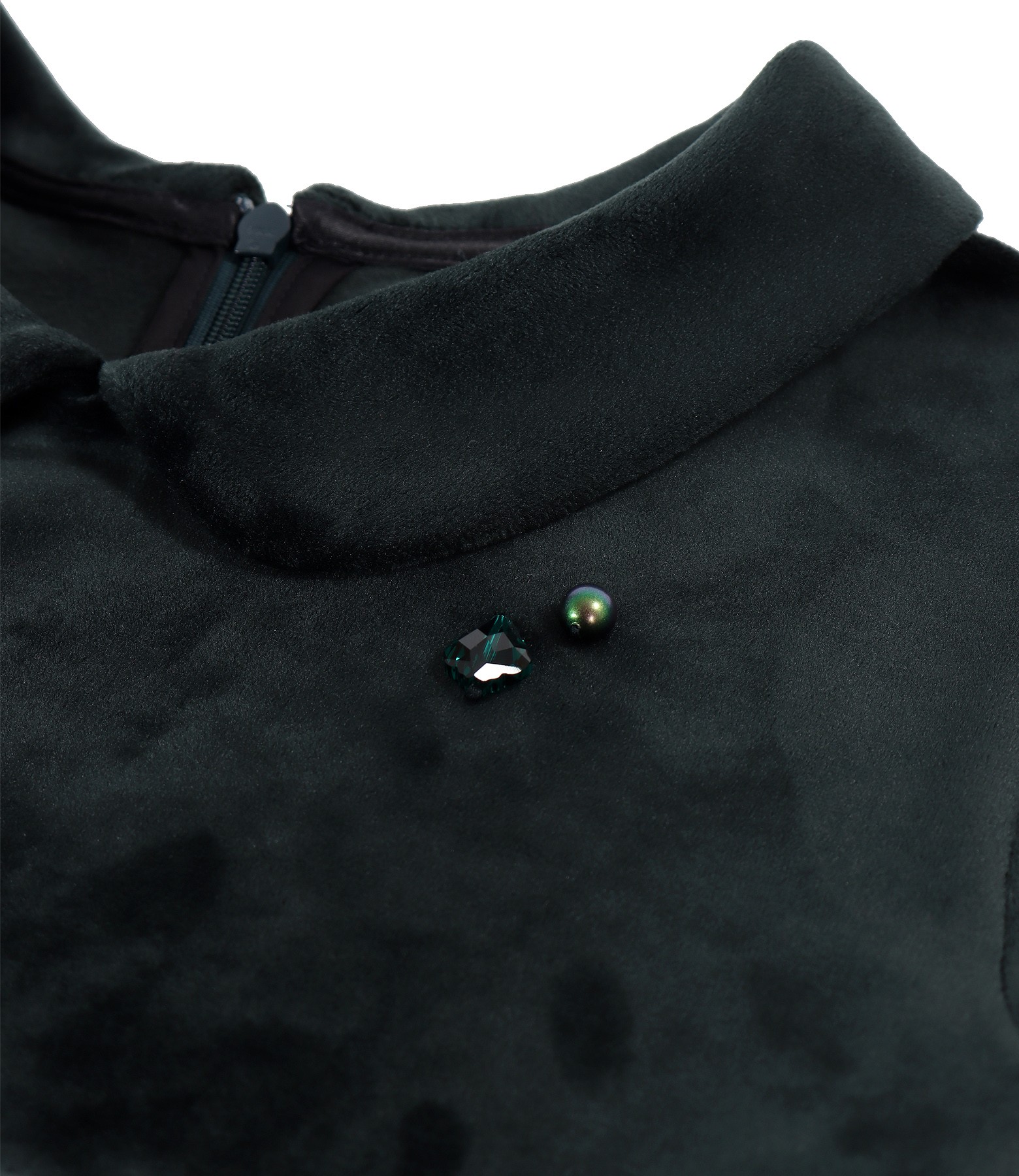 Rochie din catifea elastica uni, captusita doar la fusta, maneci lungi, guler rotund din acelasi material cu cu aplicatie de cristale la decolteu si cordon detasabil in talie. Se inchide cu fermoar ascuns pe mijloc spate.