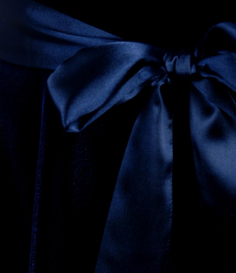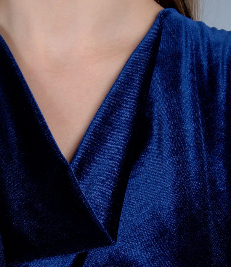 Rochie din catifea elastica cu decolteul in falduri, taiata in talie si fusta evazata. Se strange cu un cordon de saten detasabil in talie. Se inchide cu un fermoar ascuns pe lateral stanga.
