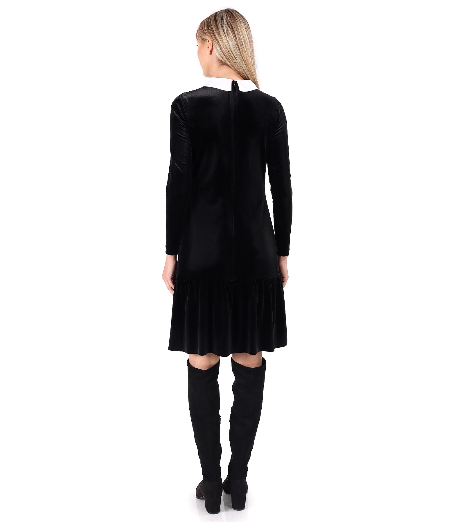 Rochie din catifea elastica cu guler ascutit si funda alba, cu volan la terminatie si cu maneci lungi. Se inchide cu fermoar ascuns pe mijloc spate.
