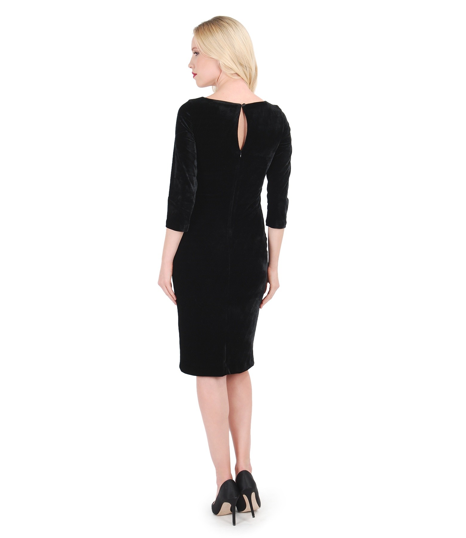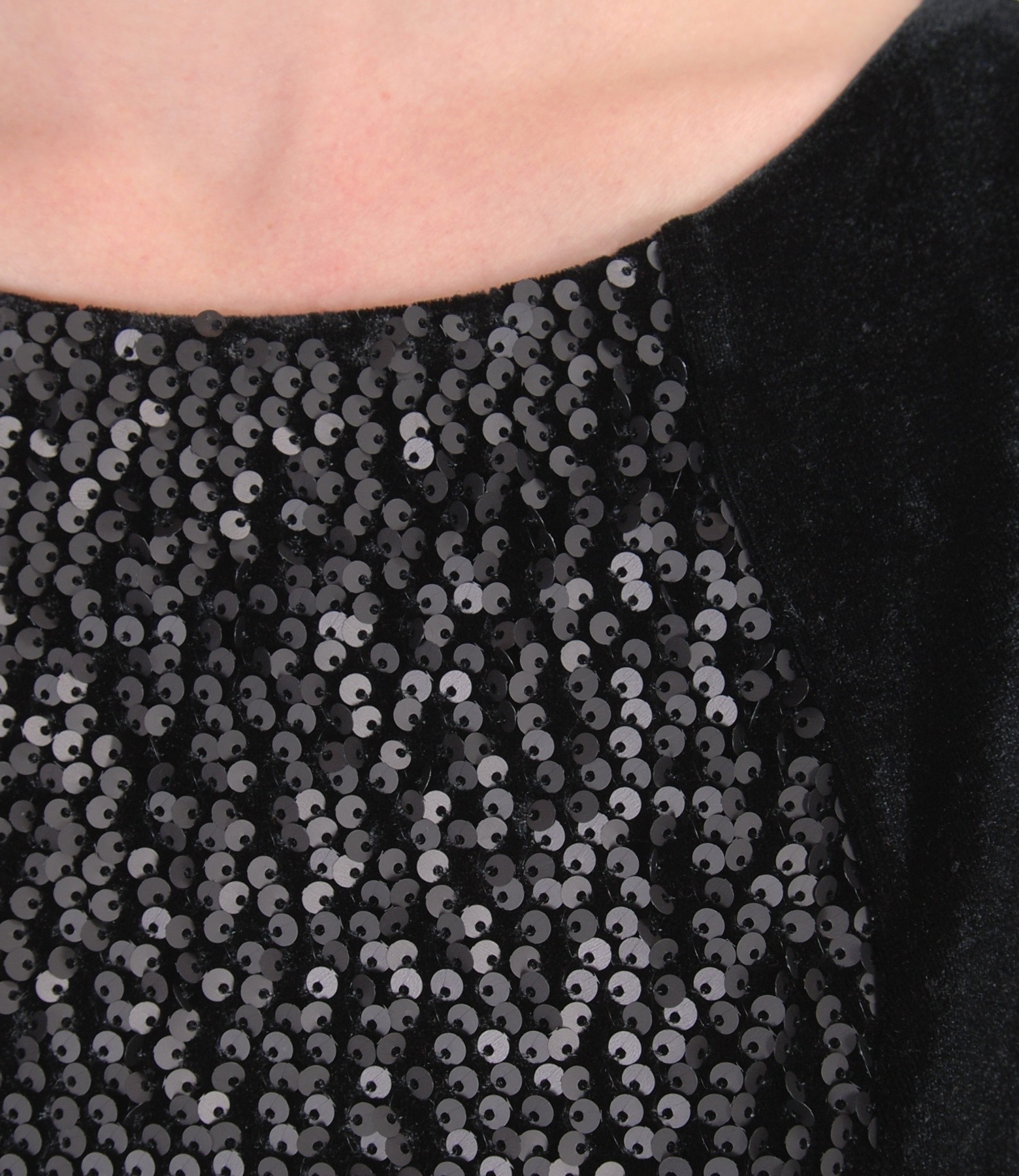 Rochie din catifea elastica neagra, cu decolteu rotund si maneci 3/4. Insertie cu paiete negru-mat pe mijloc fata. Se inchide cu fermoar ascuns pe mijloc spate.