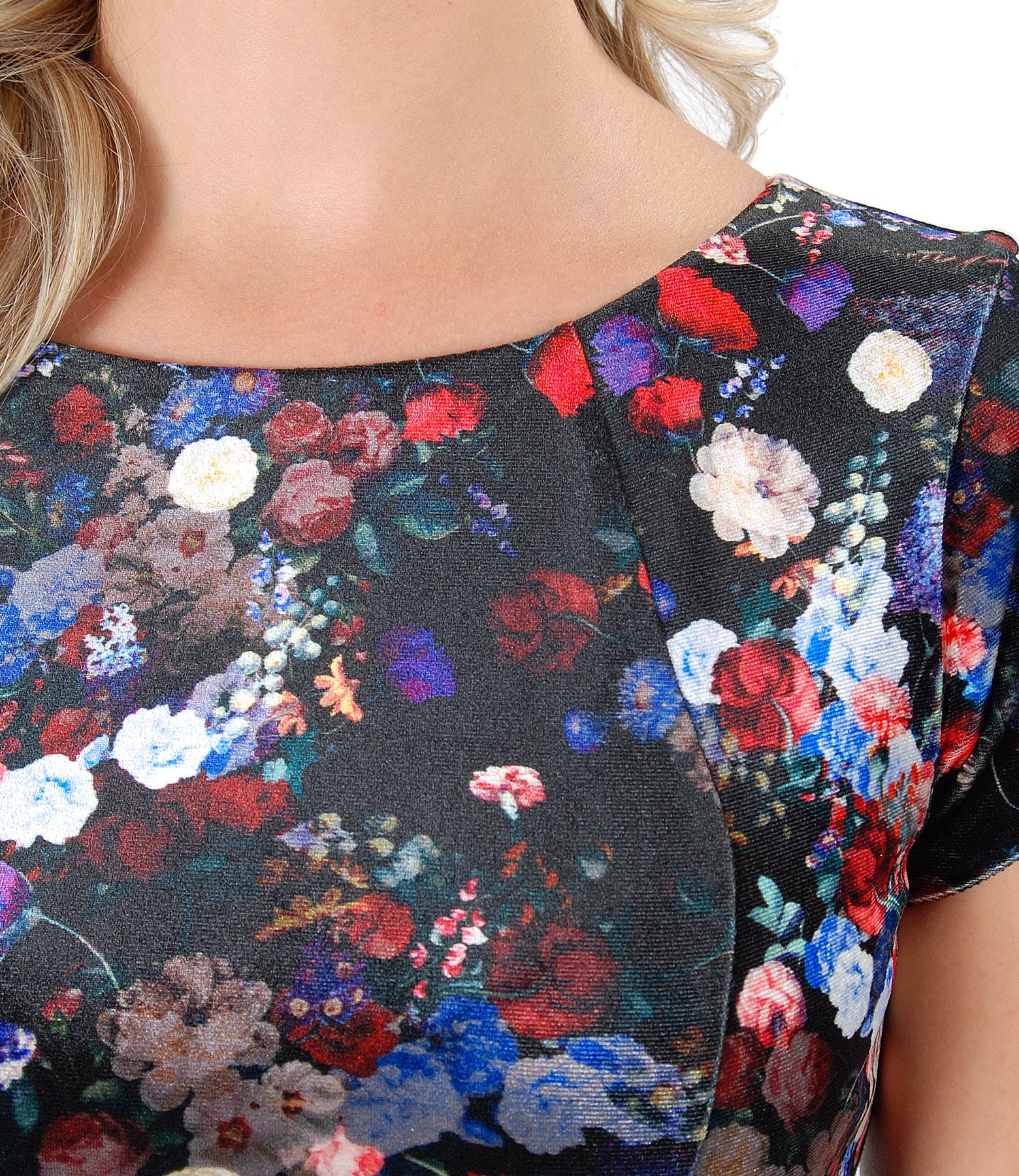 Rochie midi din catifea elastica cu motive florale, captusita, cu decolteu rotund si maneci scurte. Se inchide cu fermoar ascuns pe mijloc spate.