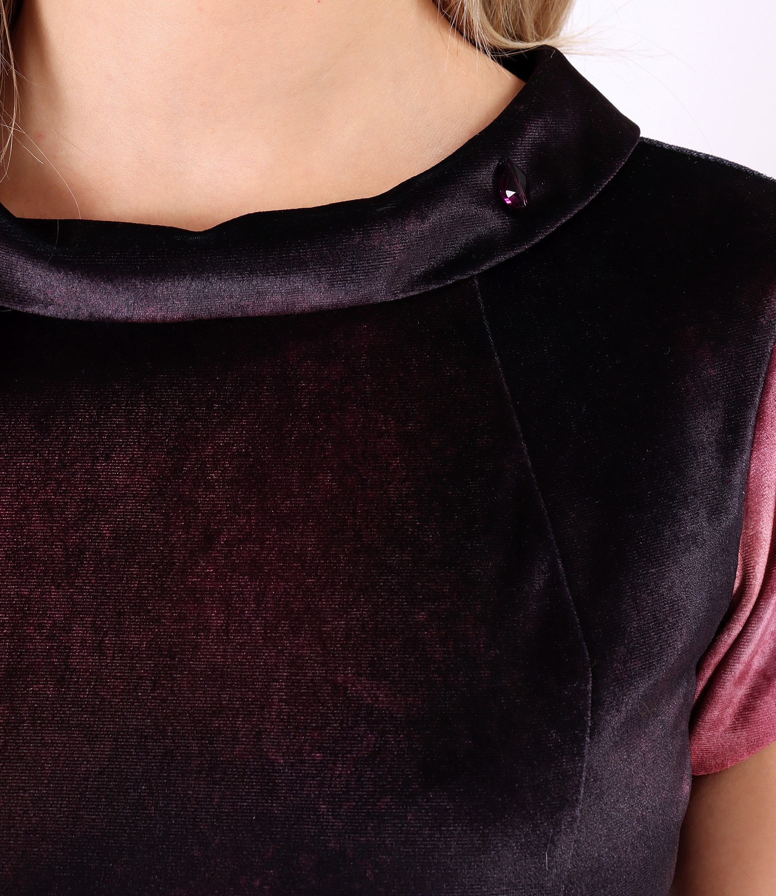 Rochie din catifea elastica, cu maneci scurte si guler rotund cu aplicatie de cristale. Se inchide cu fermoar ascuns pe mijloc spate.
