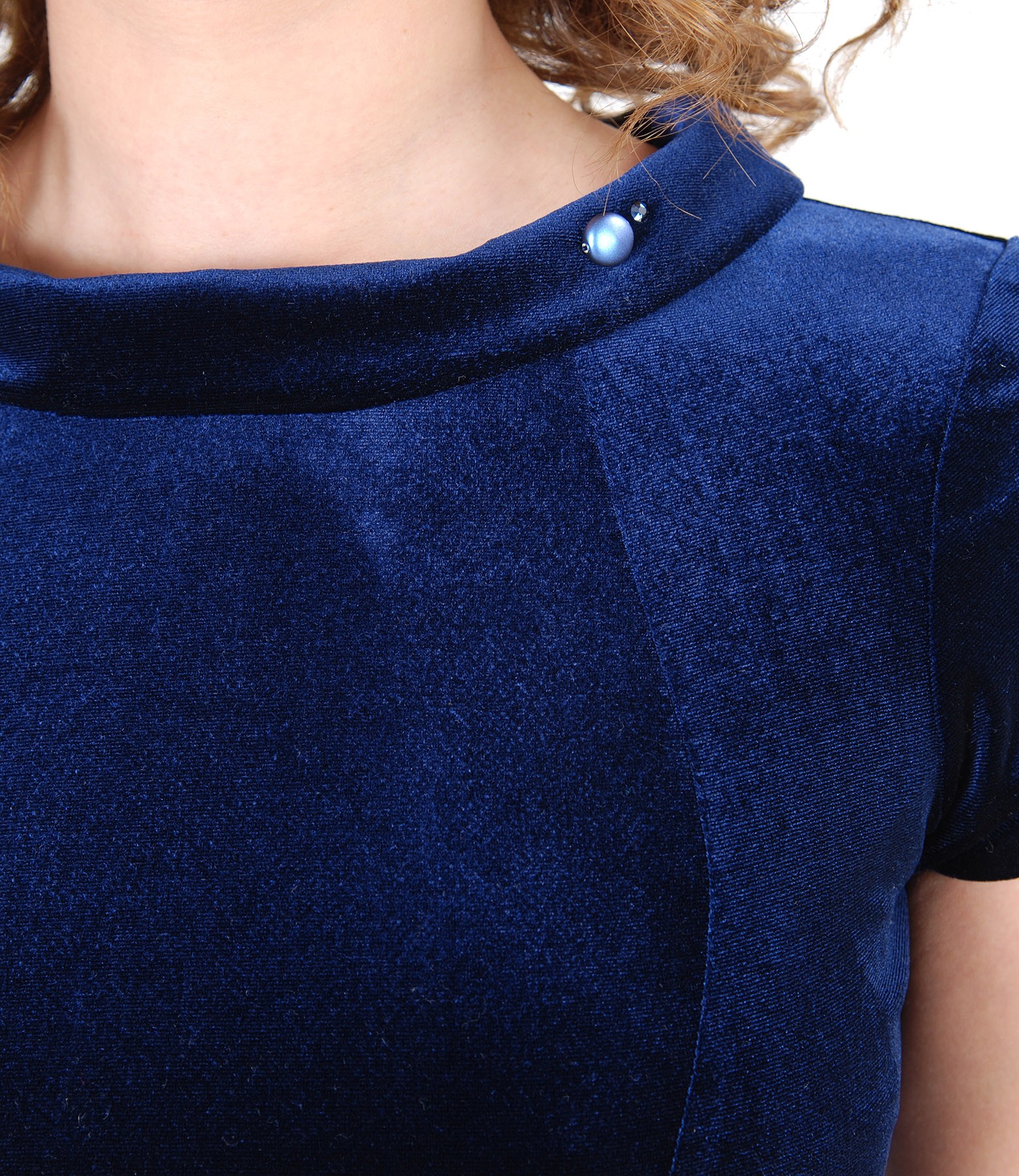 Rochie din catifea elastica bleumarin captusita, cu maneci scurte si guler rotund cu aplicatie de cristale. Se inchide cu fermoar ascuns pe mijloc spate.