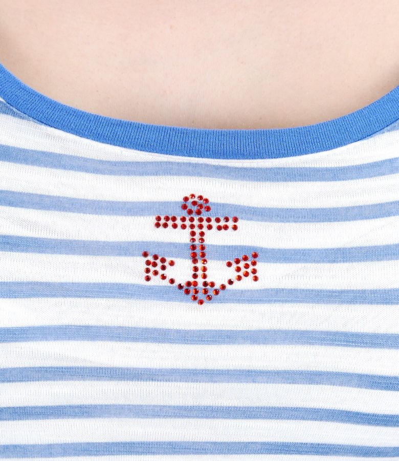 Rochie lejera din jerse elastic de viscoza moale imprimata cu bretele, dublata cu jerse alb de viscoza. Decolteu rotund fata si spate, fusta evazata si aplicatie de cristale pe fata. Nu are sistem de inchidere.