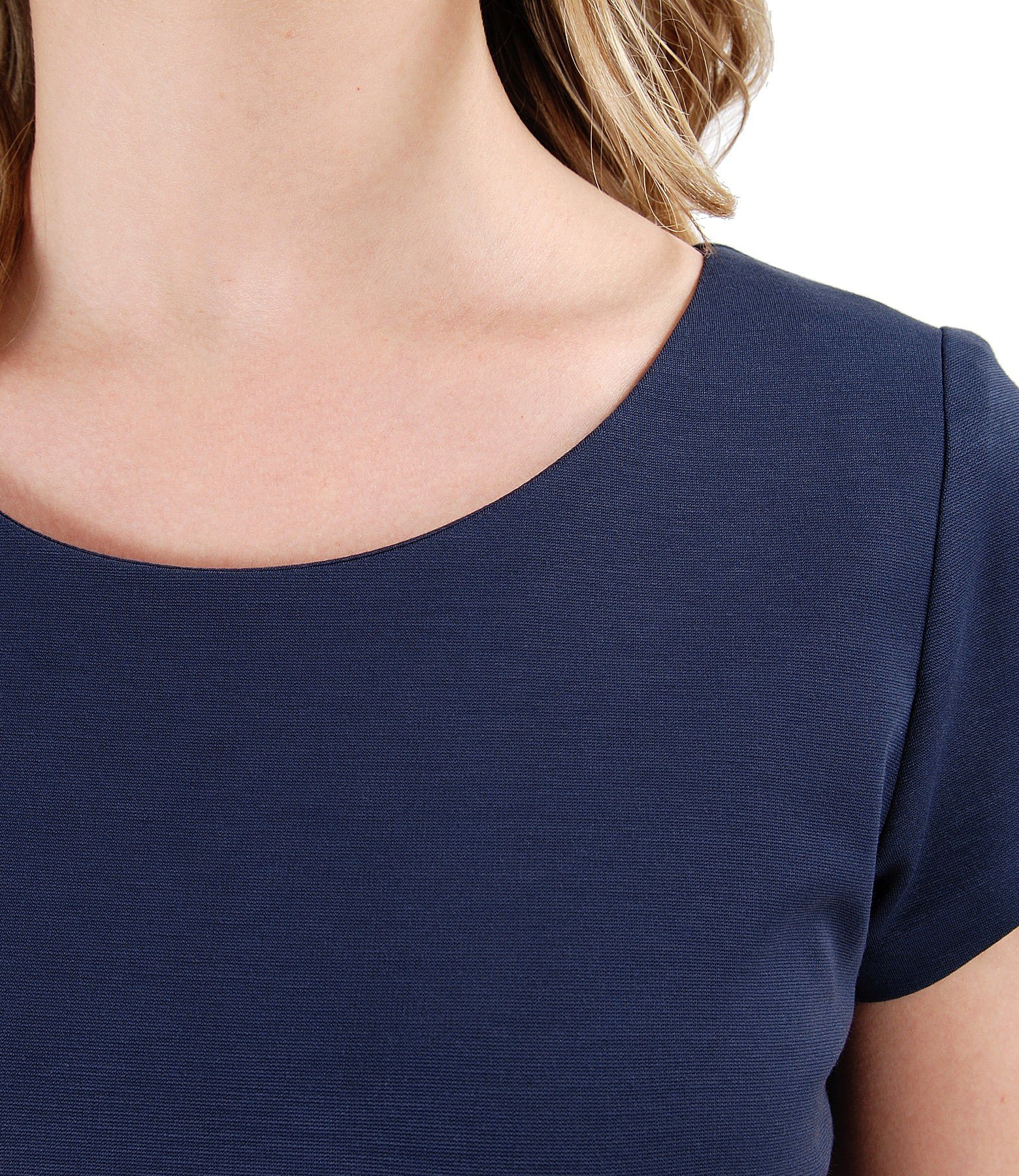 Rochie din jerse elastic, necaptusita, cu maneci scurte, decolteu rotund si buzunare laterale. Se inchide cu fermoar ascuns pe mijloc spate.