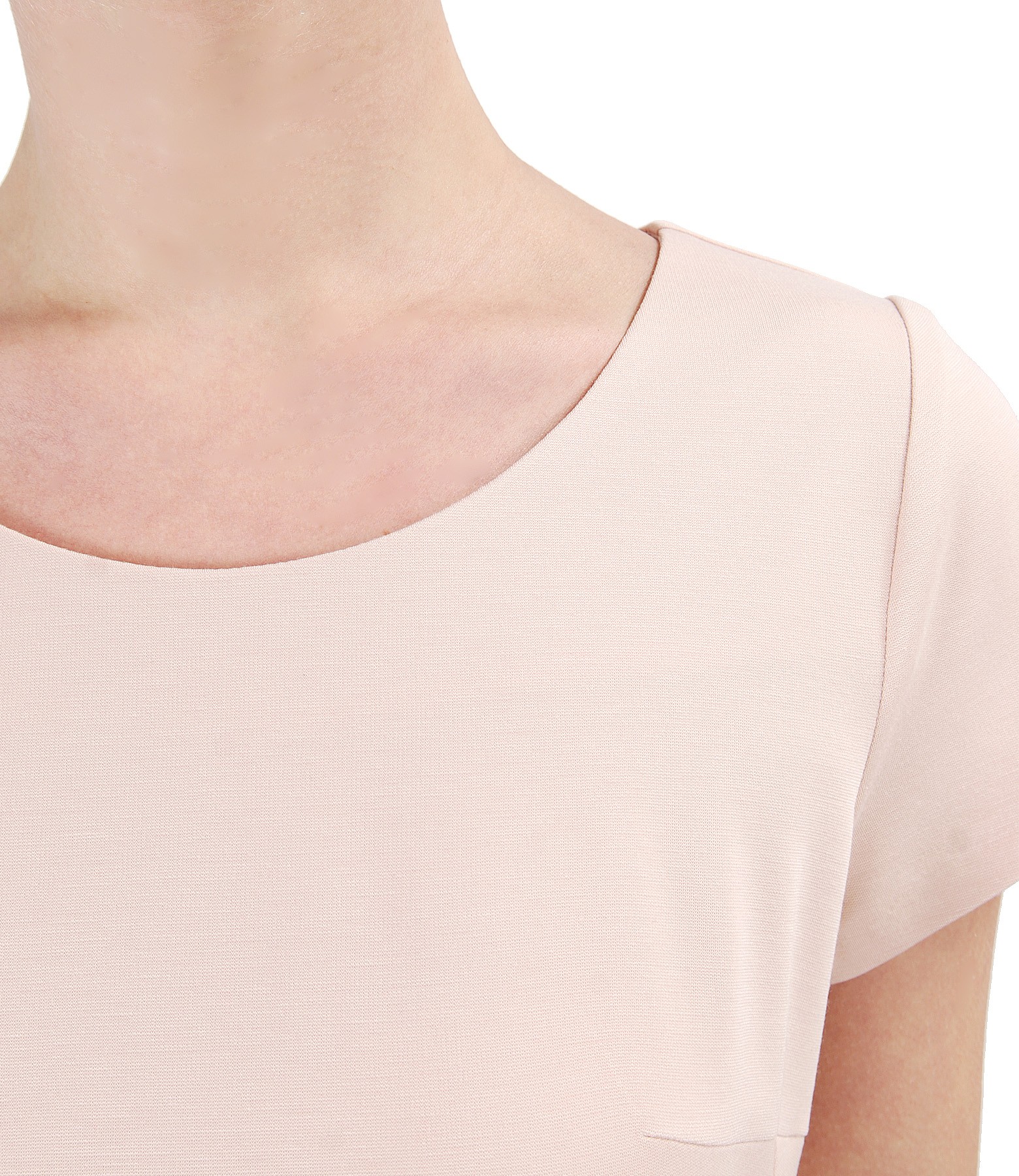 Rochie din jerse elastic, necaptusita, cu maneci scurte, decolteu rotund si buzunare laterale. Se inchide cu fermoar ascuns pe mijloc spate.