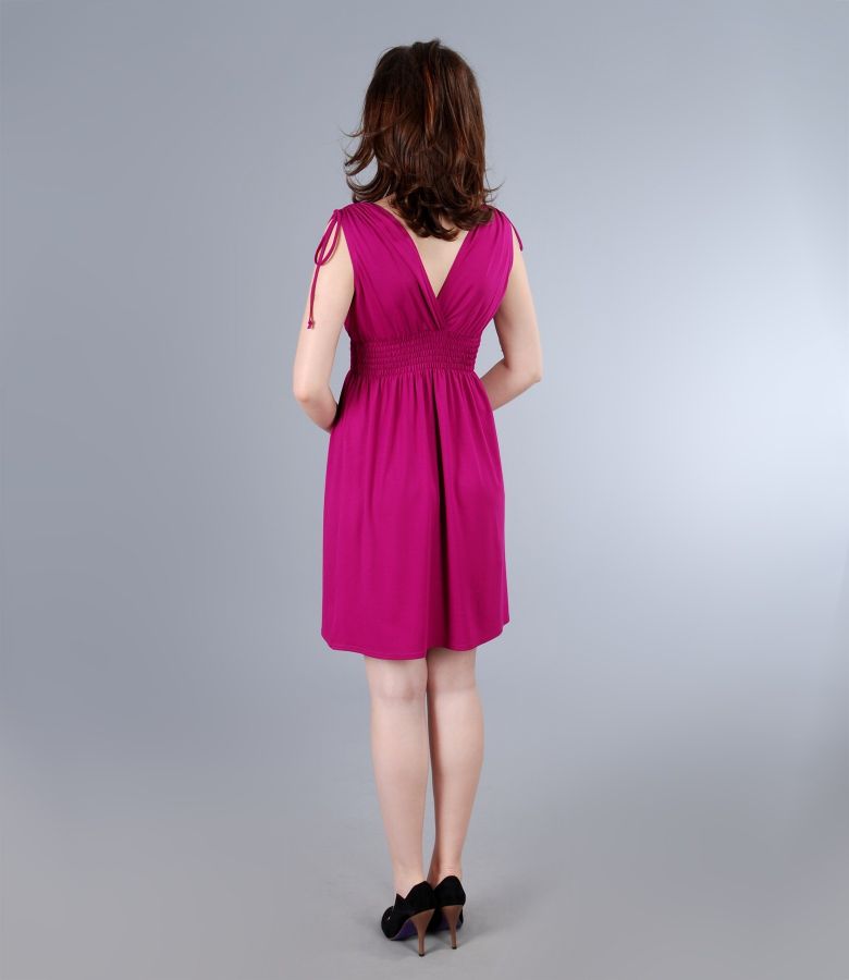 Rochie necaptusita din jerse elastic, lejera, cu fusta evazata si umeri incretiti, stransi in funda cu siret. Talie elasticizata fata si spate, decolteu in V format prin suprapunerea pieptilor. Nu are sistem de inchidere