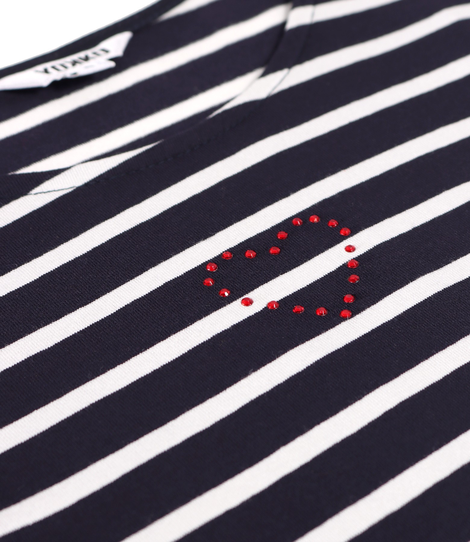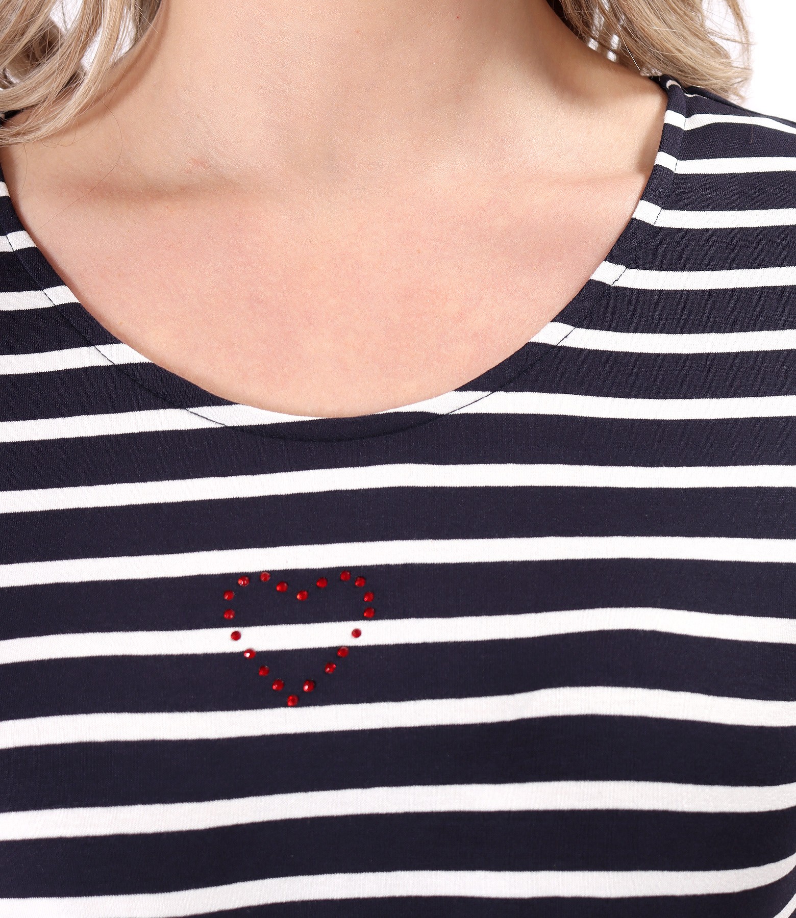 Rochie din jerse elastic de viscoza cu dungi, necaptusita, cu buzunare laterale, decolteu rotund cu aplicatie decorativa in forma de inima si elastic in talie. Nu are sistem de inchidere.