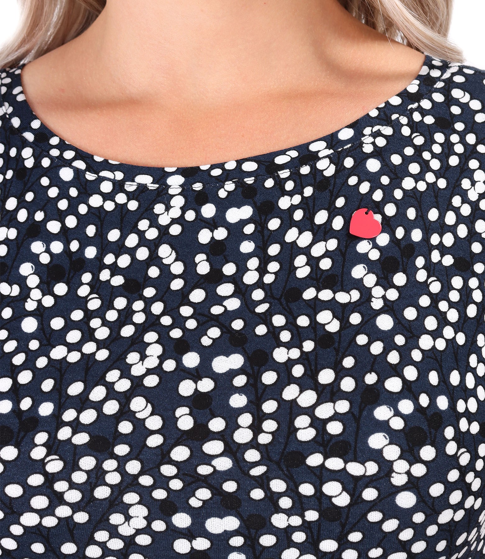 Rochie din jerse elastic de viscoza, imprimat cu picouri si crengute, necaptusita, cu decolteu barcuta cu inima metalica cusuta pe fata si umeri cazuti.