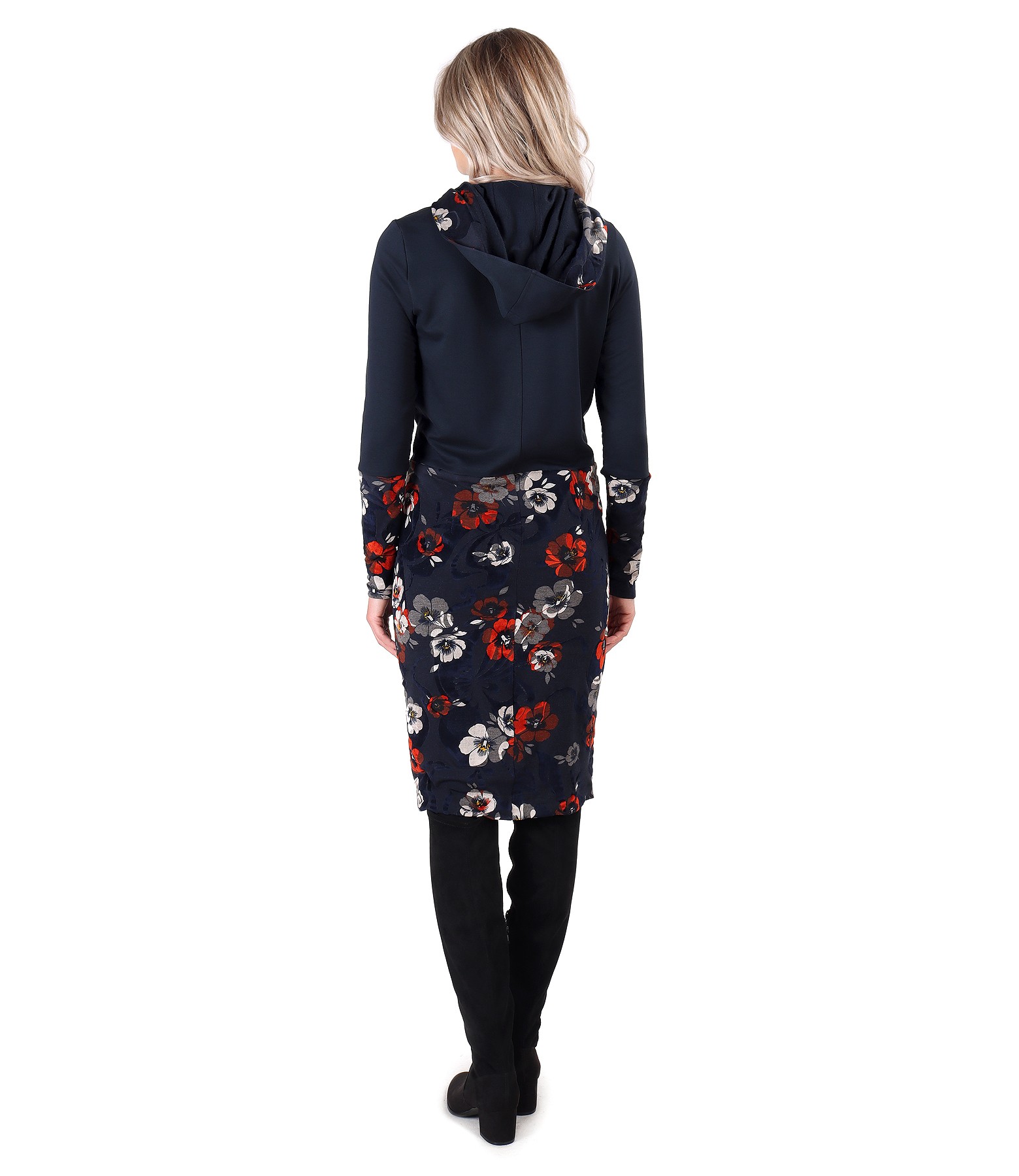 Rochie din jerse elastic flausat si catifea brocata cu motive florale, cu fusta captusita, gluga si buzunare laterale. Nu are sistem de inchidere.
