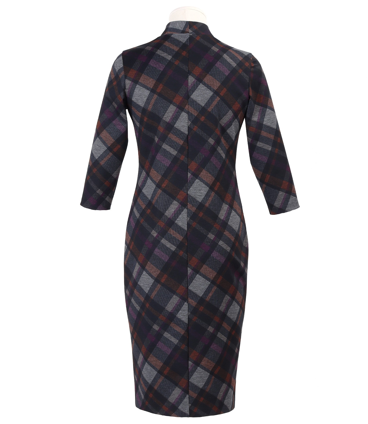 Rochie midi din jerse elastic gros in carouri, captusita, cu fermoar cu dubla deschidere pe mijloc fata, maneci lungi si guler gen tunica.