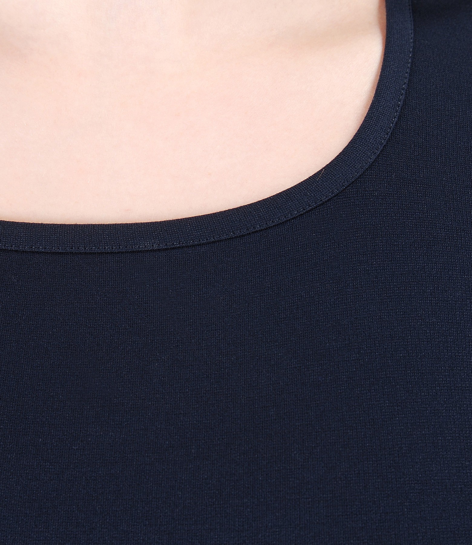 Rochie necaptusita din jerse elastic gros, cu decolteu rotund si garnitura elastica aplicata in talie si la terminatia manecilor. Se inchide cu fermoar ascuns pe mijloc spate.