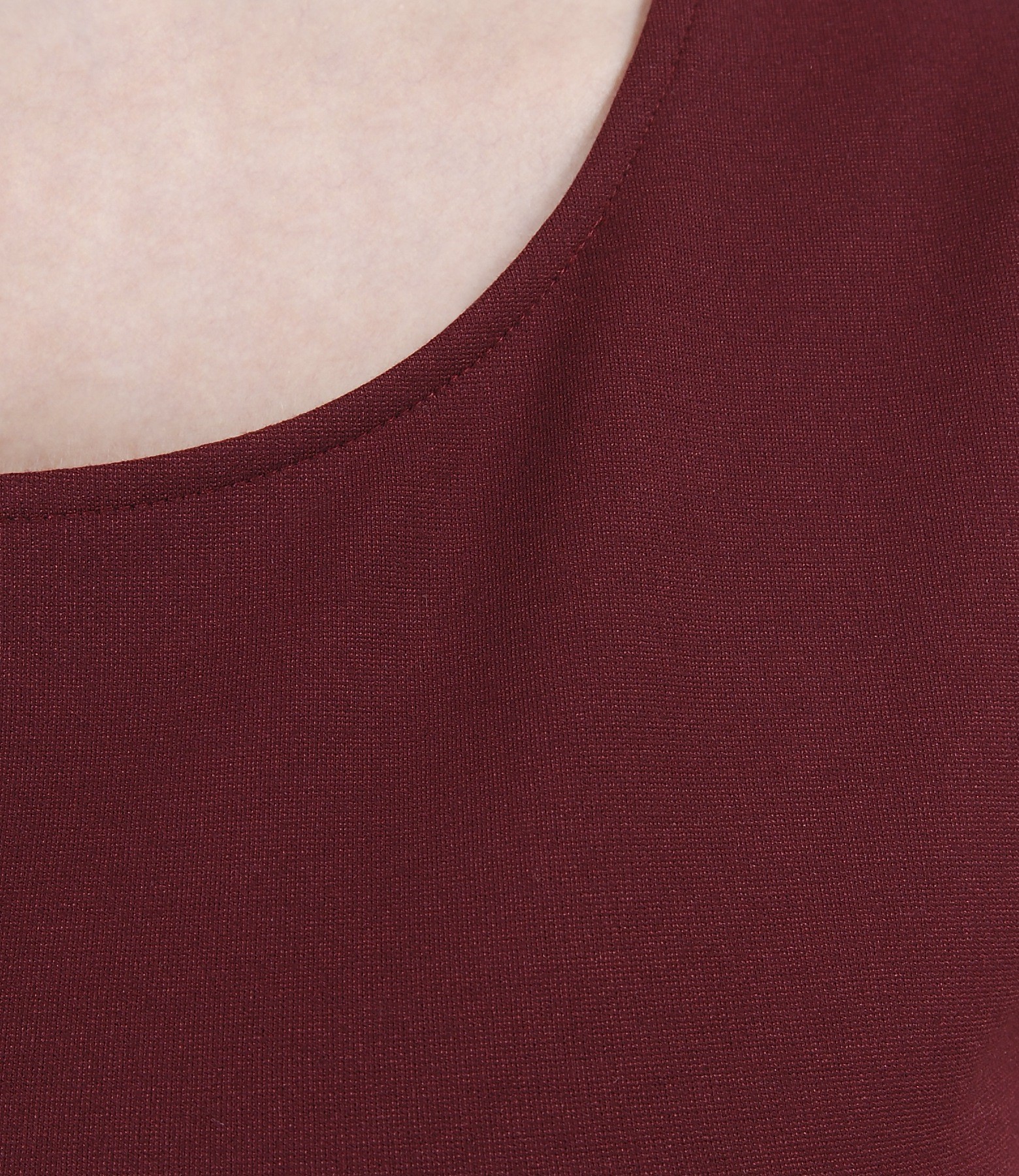 Rochie necaptusita din jerse elastic gros, cu decolteu rotund si umeri cazuti. Se inchide cu fermoar ascuns pe mijloc spate.
