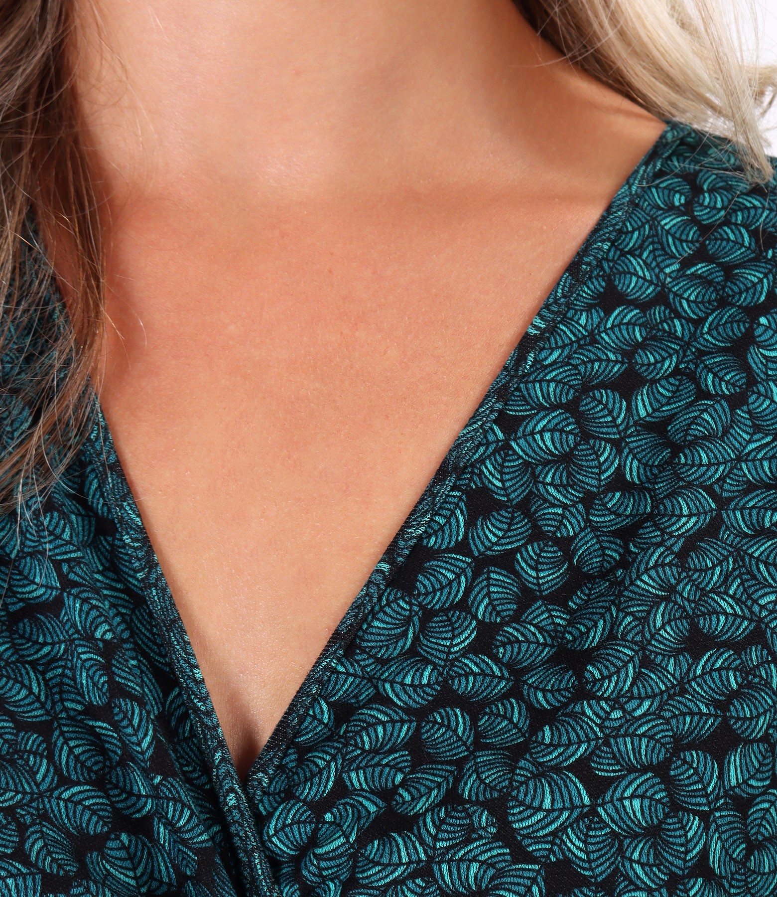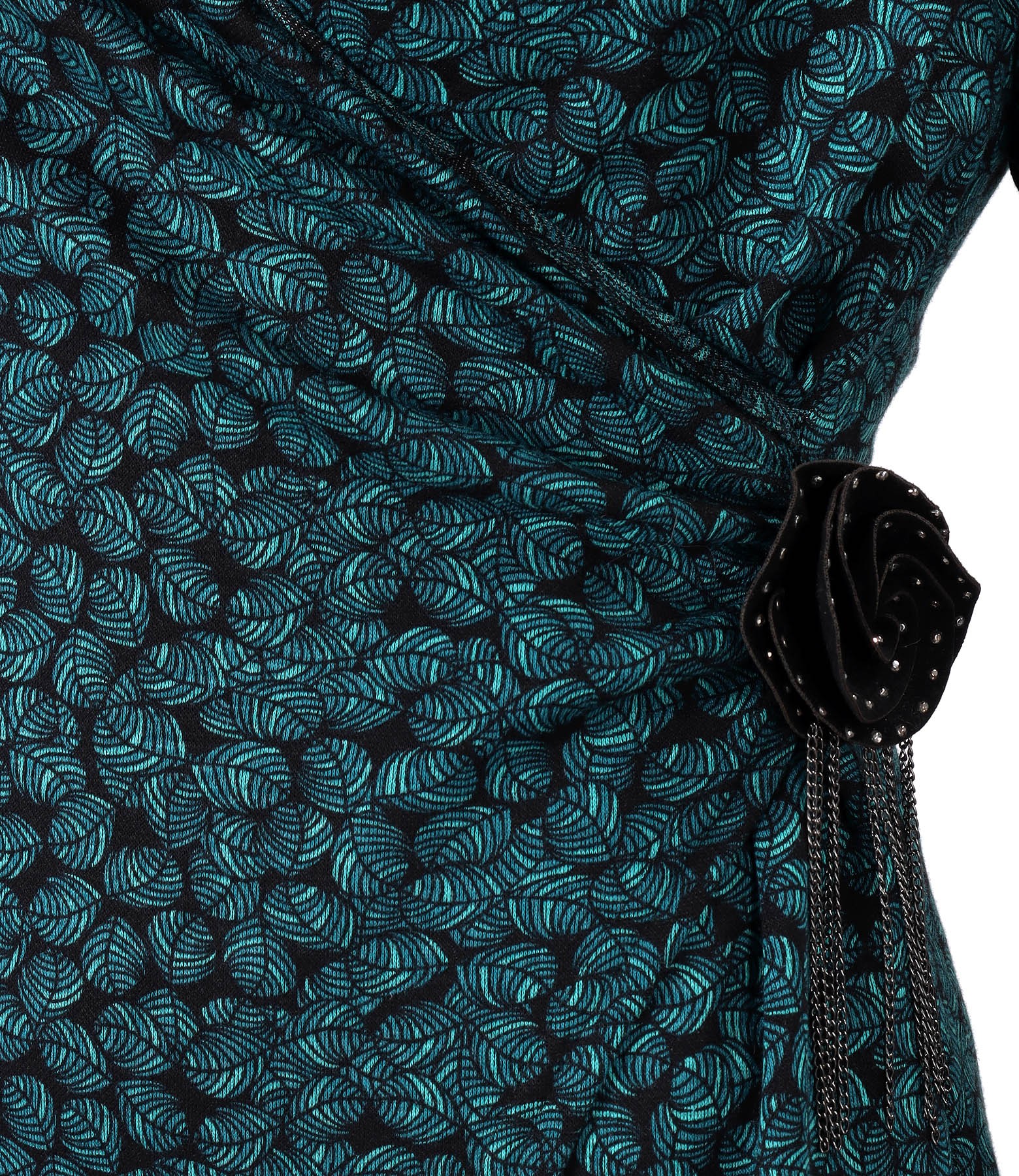 Rochie din jerse elastic gros imprimat cu frunze, necaptusita, cu maneci 3/4, cu pieptii suprapusi si brosa in talie. Nu are sistem de inchidere.