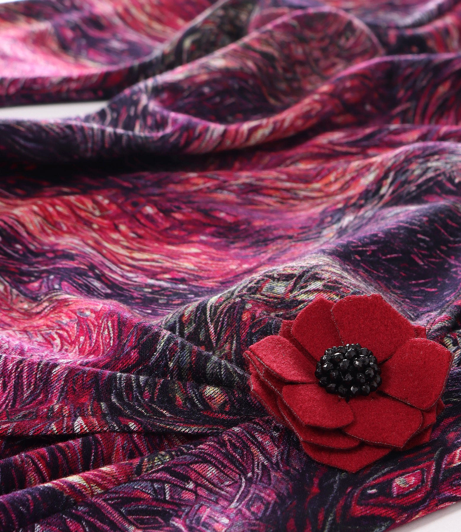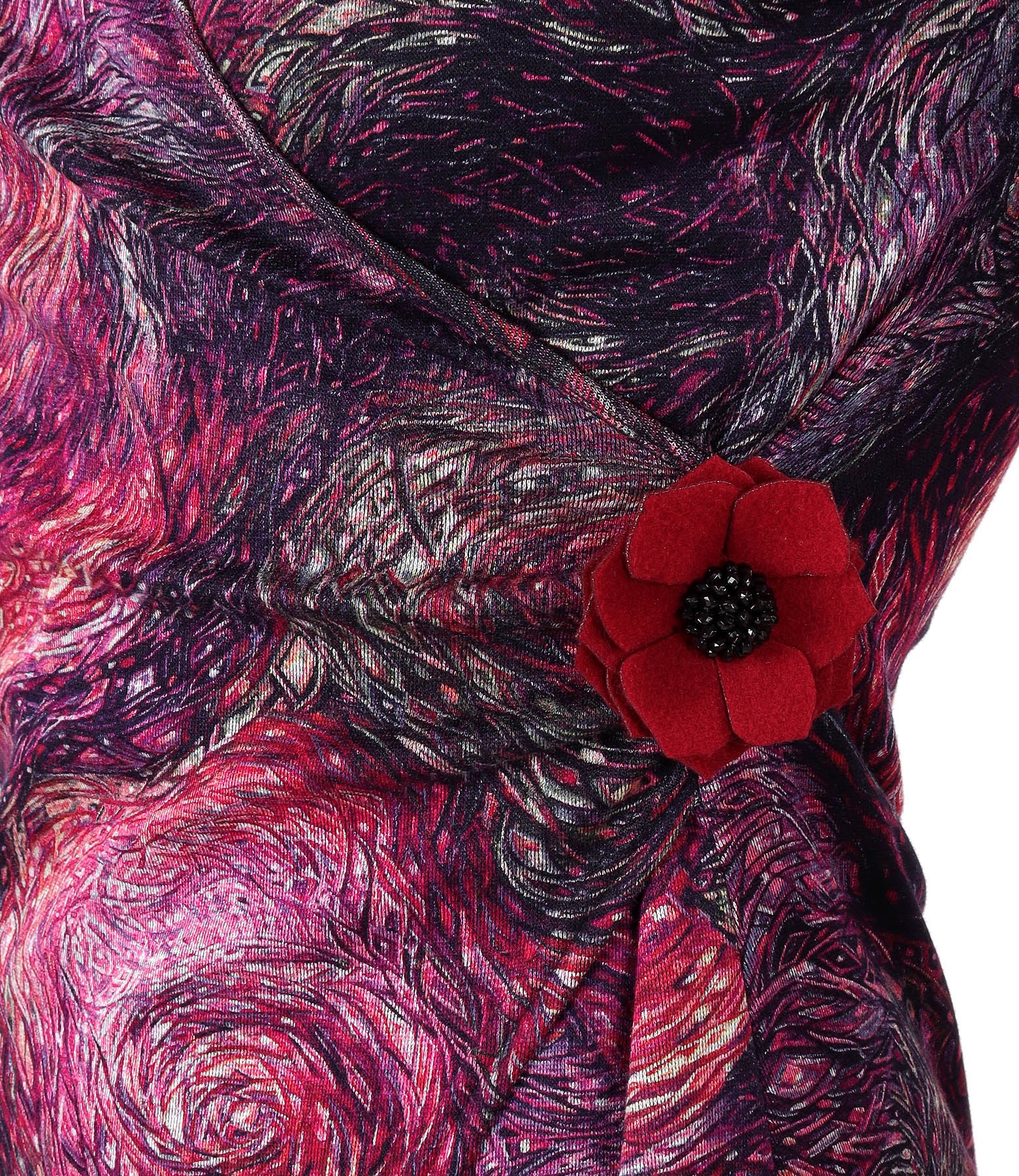 Rochie din jerse elastic gros imprimat cu motive geometrice, necaptusita, cu maneci 3/4, cu pieptii suprapusi si brosa in talie. Nu are sistem de inchidere.
