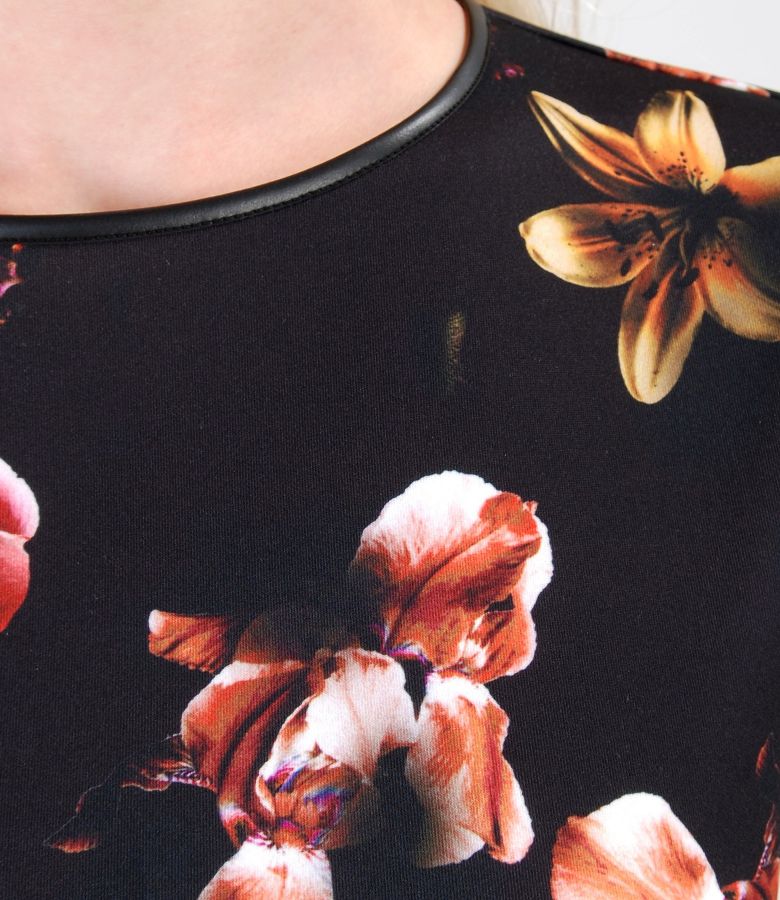 Rochie din jerse elastic gros, imprimat digital, cu decolteul rotund si umeri cazuti. Se inchide cu fermoar metalic pe mijloc spate.