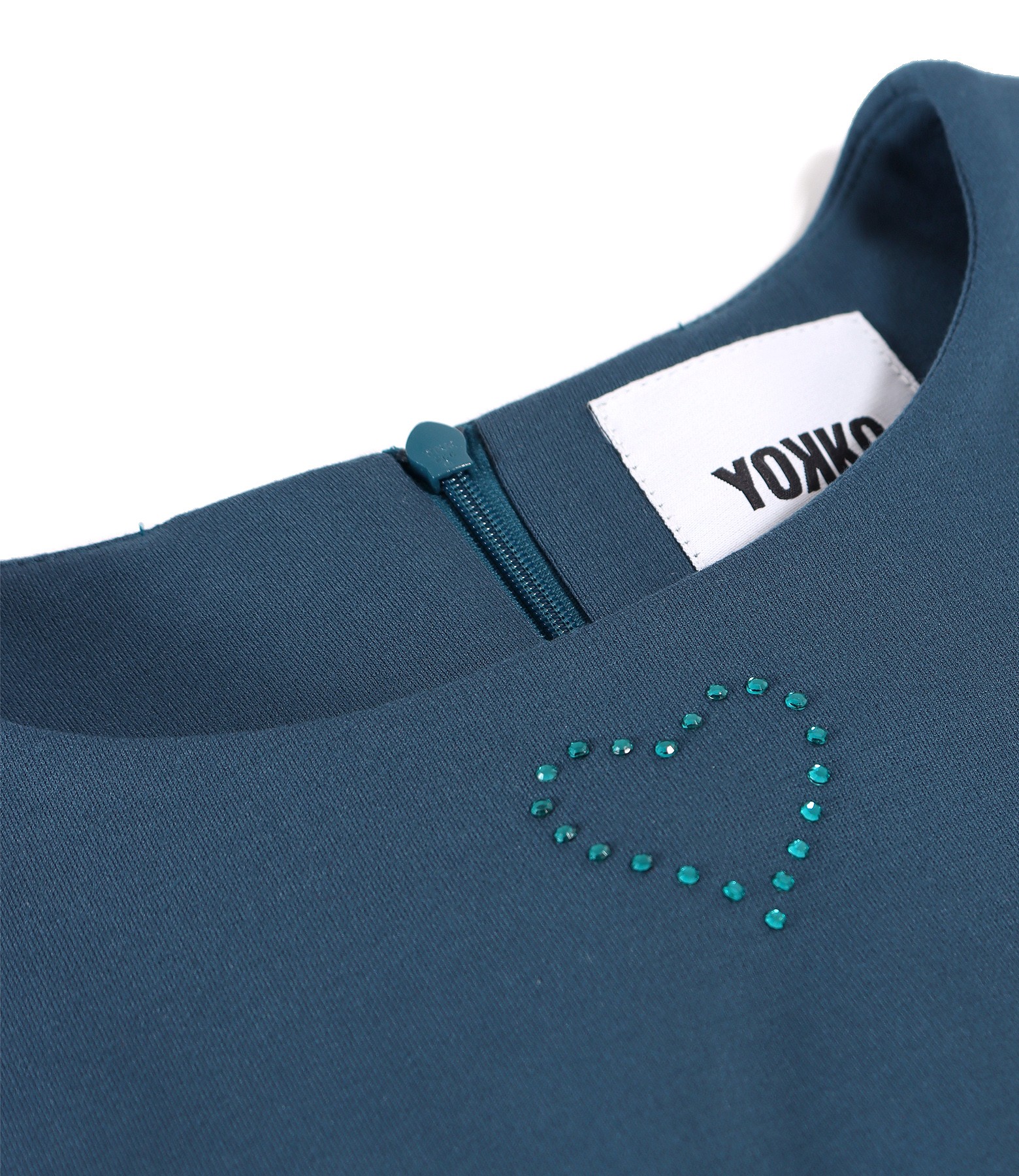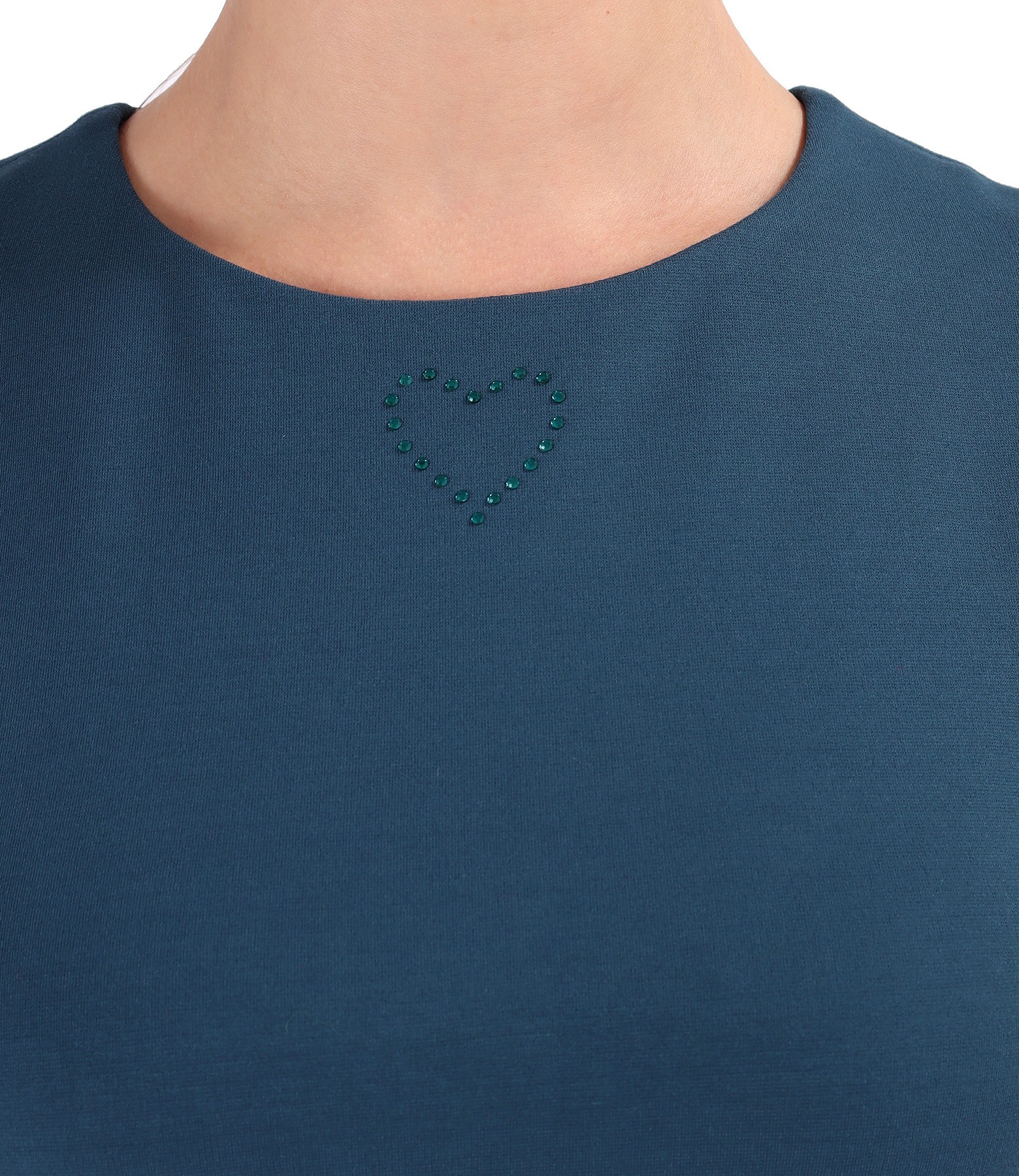Rochie eleganta din jerse elastic gros, necaptusita, cu maneci scurte tip chimono, decolteu rotund cu inima decorativa. Se inchide cu fermoar ascuns pe mijloc spate.