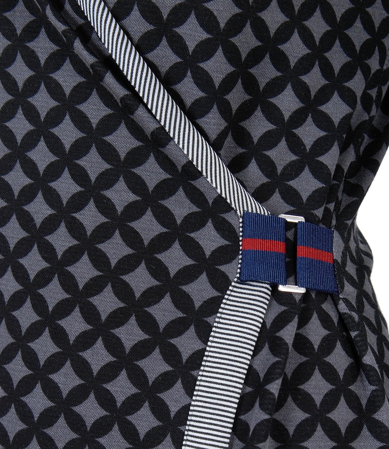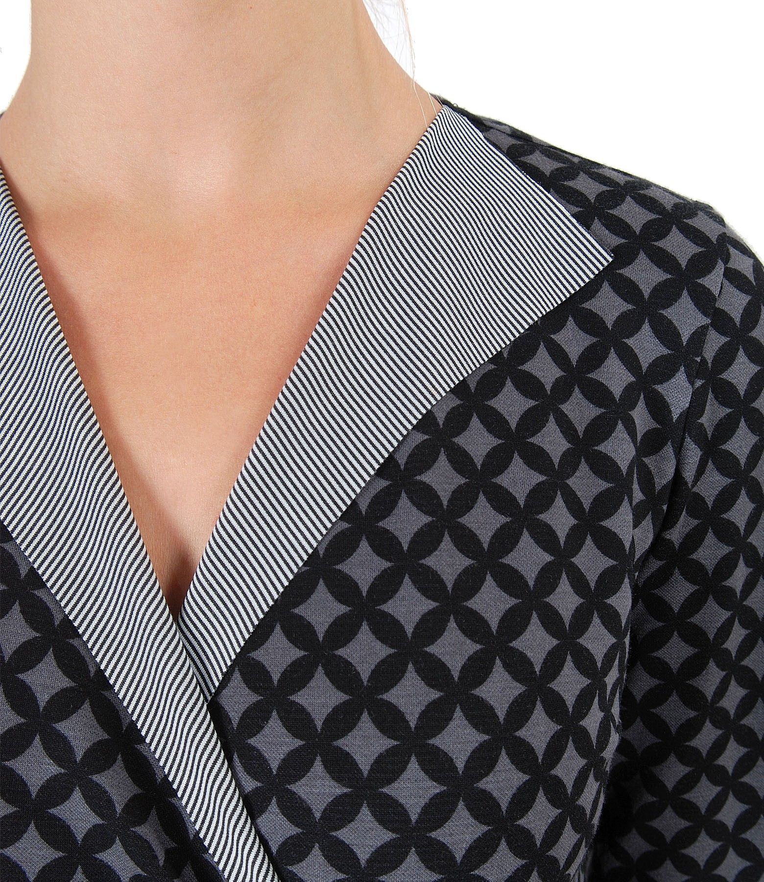 Rochie eleganta din jerse elastic imprimat cu motive geometrice, cu maneci 3/4, pieptii petrecuti si banda de rips aplicata pe lateral stanga. Nu are sistem de inchidere.
