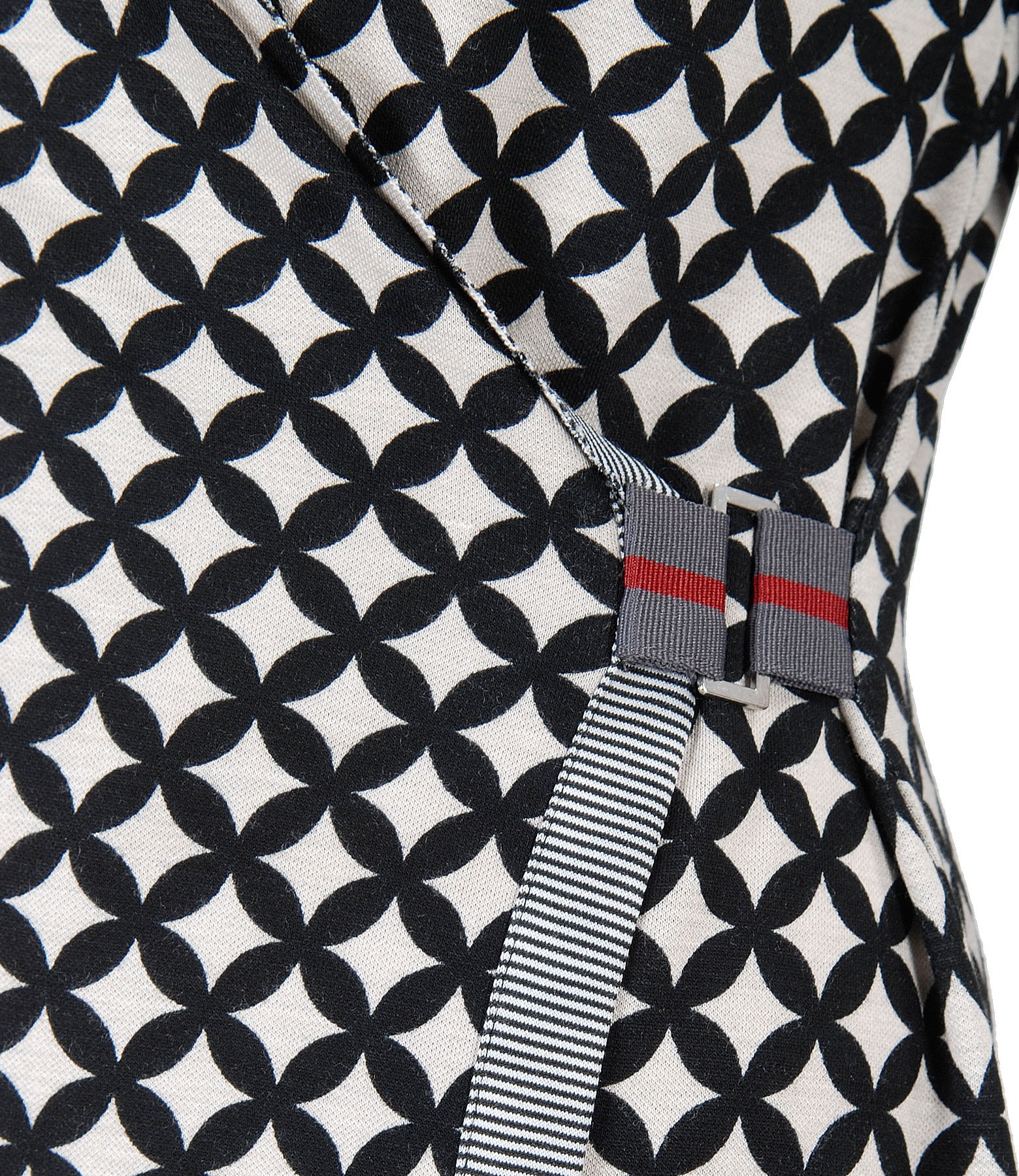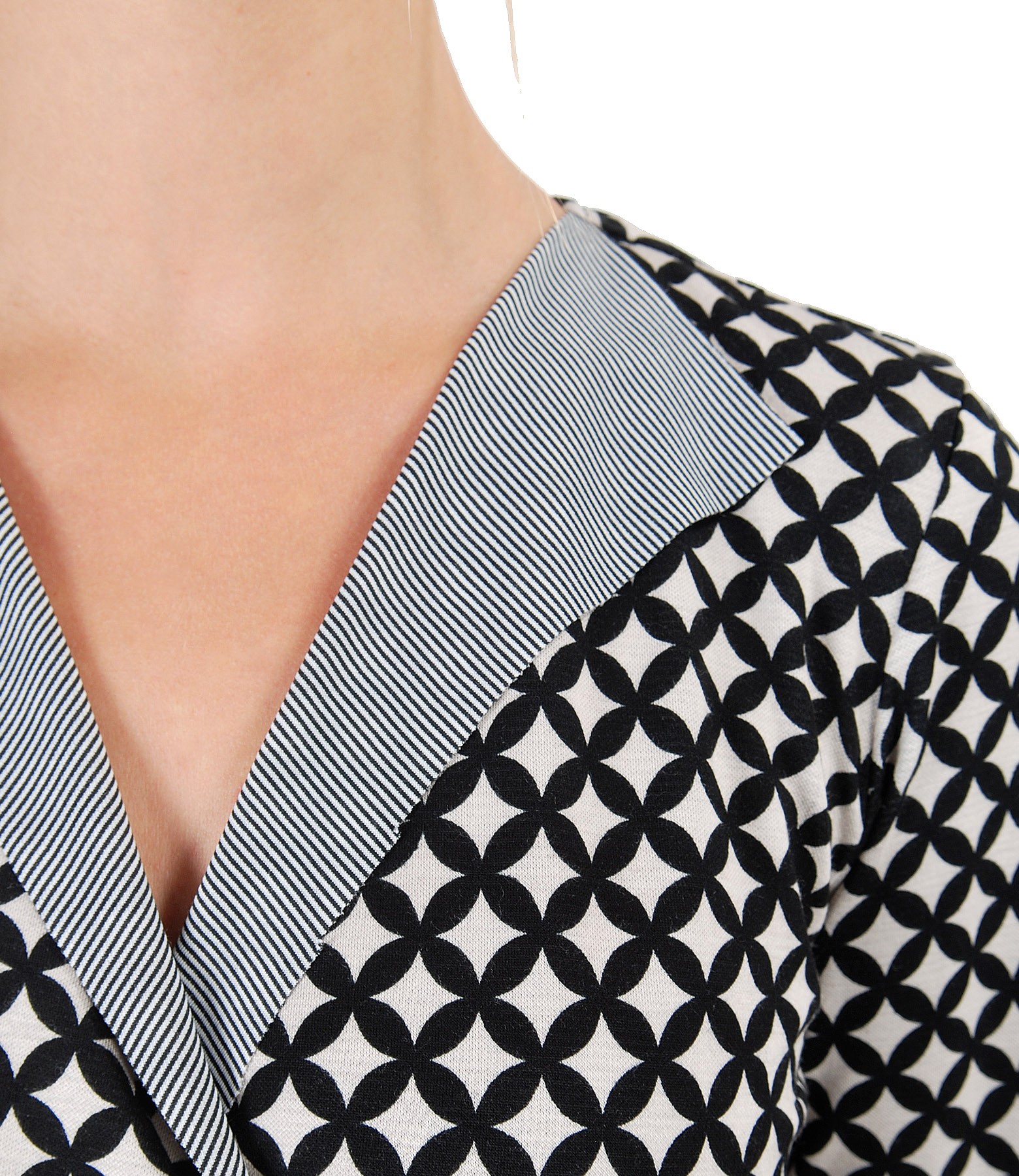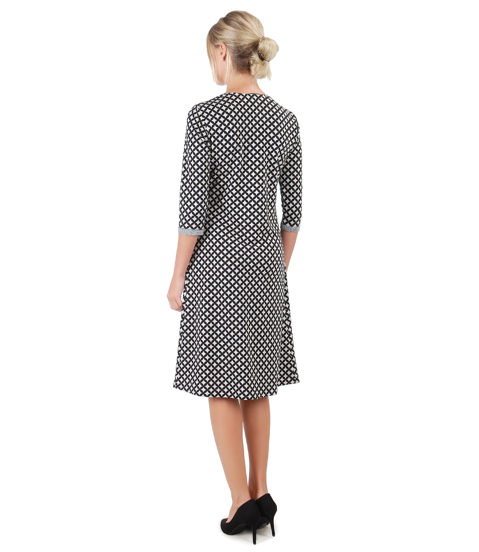 Rochie eleganta din jerse elastic imprimat cu motive geometrice, cu maneci 3/4, pieptii petrecuti si banda de rips aplicata pe lateral stanga. Nu are sistem de inchidere.