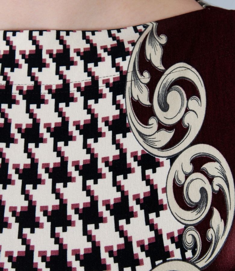 Rochie comoda din jerse elastic, cu motive geometrice, usor evazata, cu decolteu la baza gatului. Nu are sistem de inchidere.