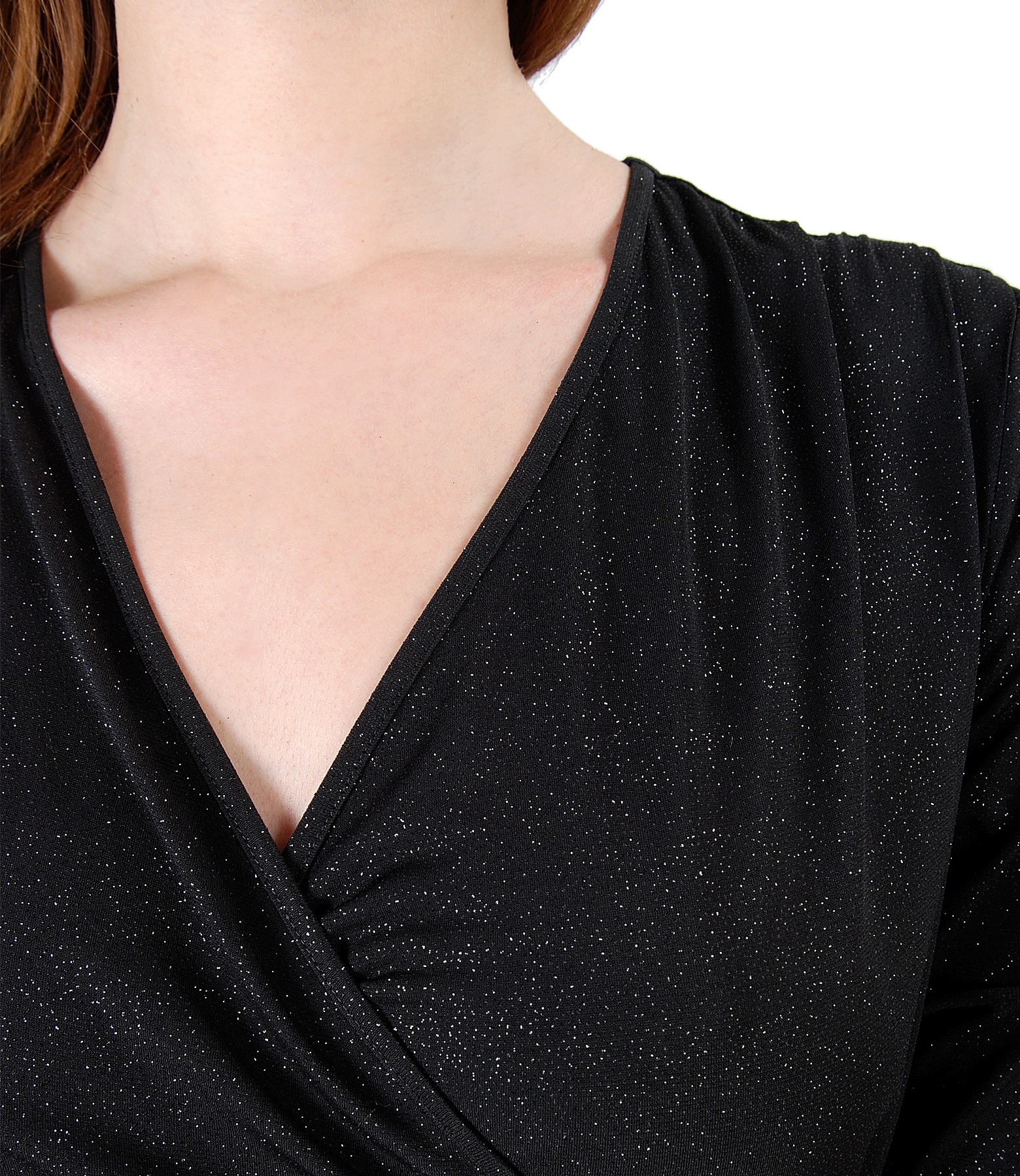 Rochie eleganta din jerse elastic cu efect lucios, necaptusita, cu maneci 3/4 si pieptii petrecuti. Nu are sistem de inchidere.