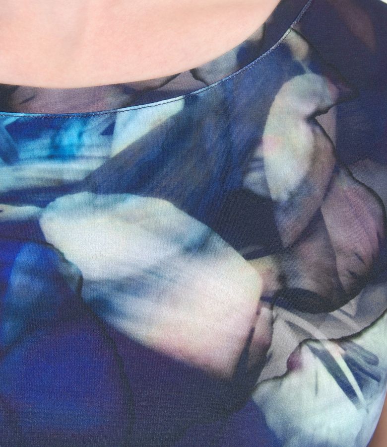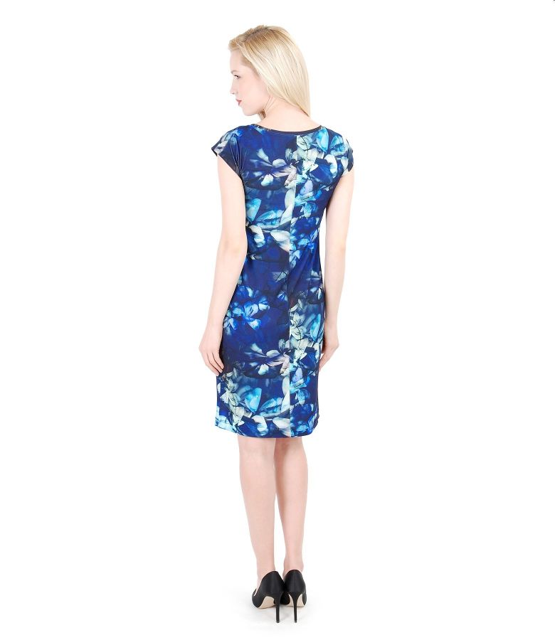 Rochie necaptusita, din jerse elastic imprimat, cu umeri cazuti si linie usor evazata, taiata pe mijloc spate. Nu are sistem de inchidere.