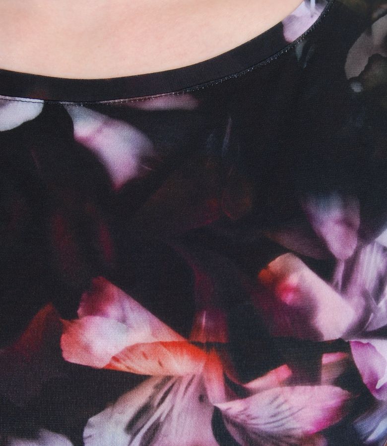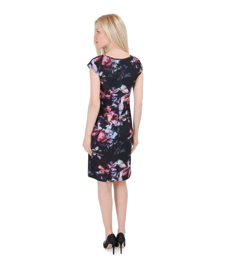 Rochie necaptusita, din jerse elastic imprimat, cu umeri cazuti si linie usor evazata, taiata pe mijloc spate. Nu are sistem de inchidere.