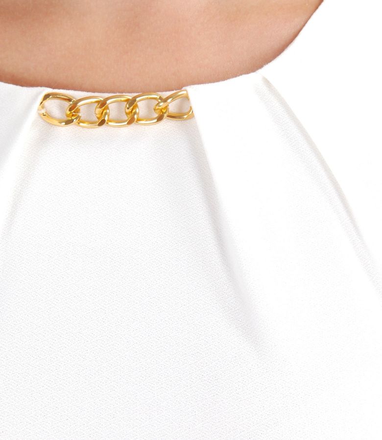 Rochie din jerse elastic, fara maneci, cu decolteul rotund cu pliuri si garnitura lant metalic. Nu are sistem de inchidere