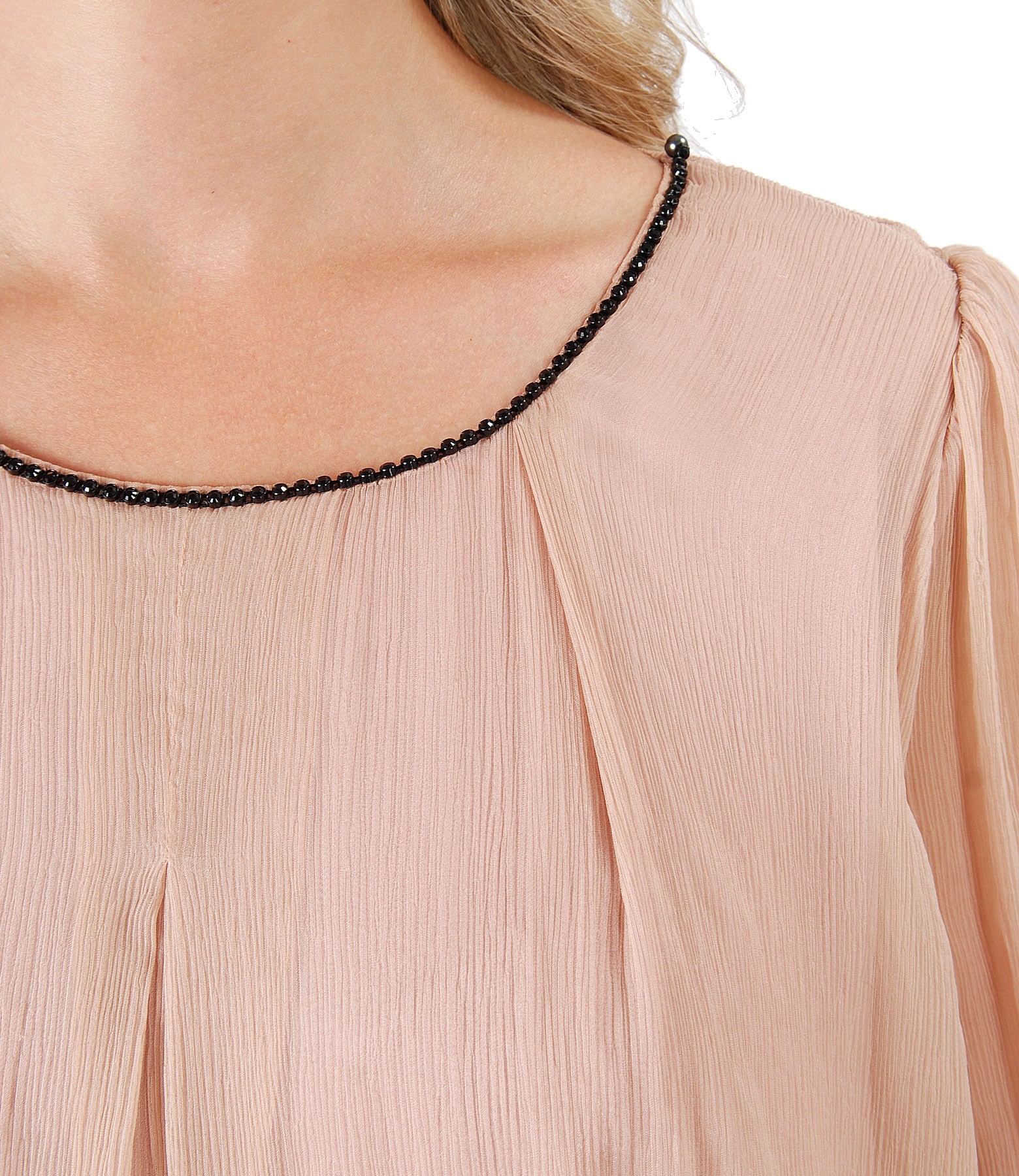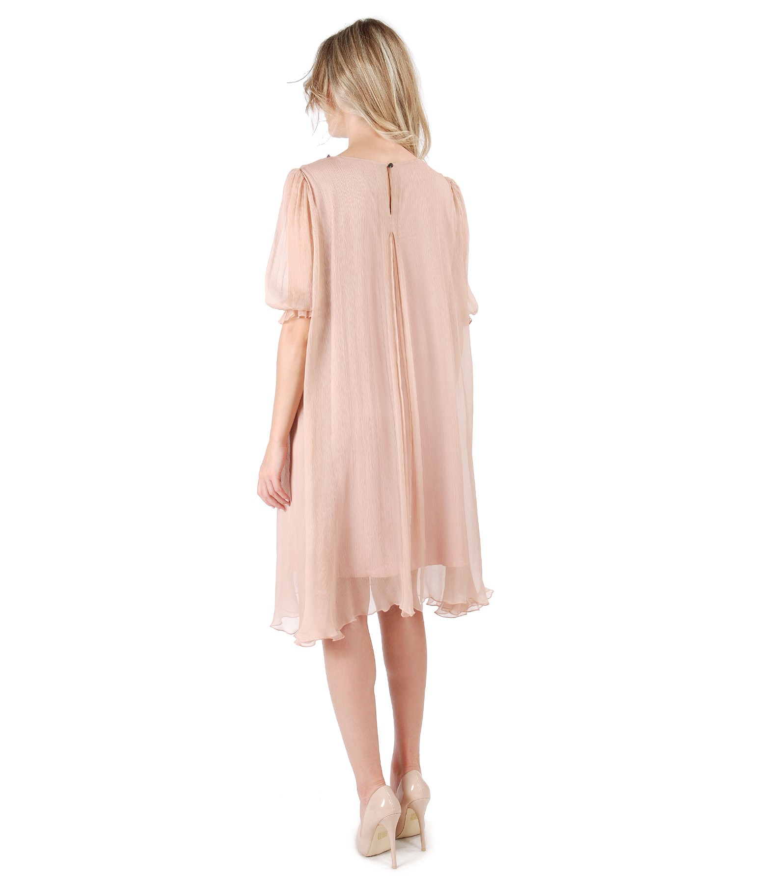Rochie evazata din voal de matase, dublata cu saten, cu maneci bufante si aplicatie de cristale pe decolteul rotund. Se inchide cu un nasture pe spate.