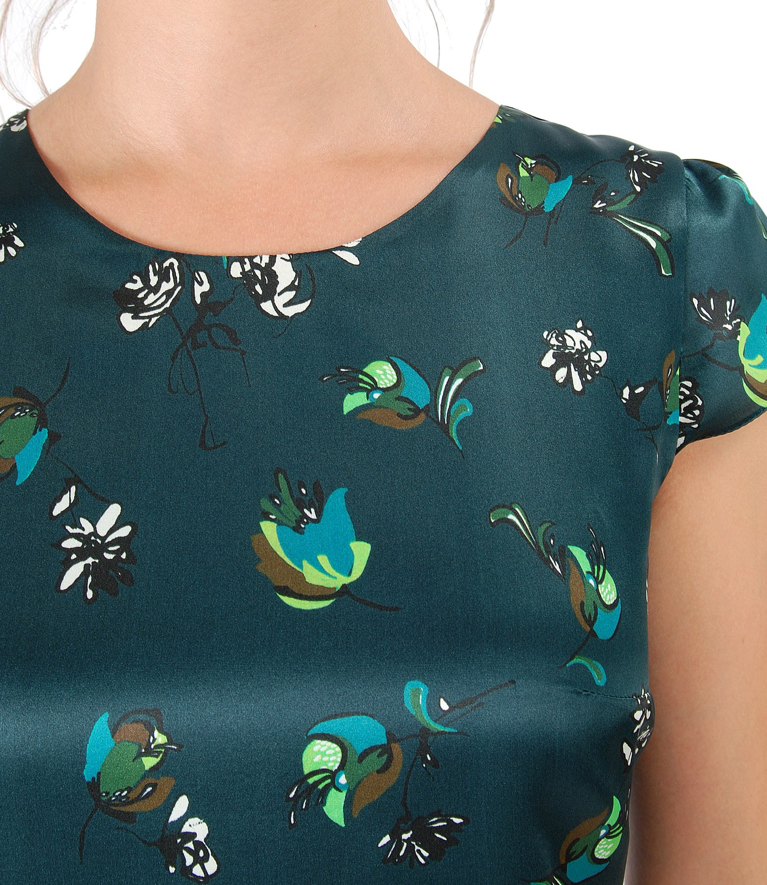 Rochie din matase imprimata cu motive florale, dublata cu viscoza, cu maneci scurte si decolteu rotund. Se inchide cu un nasture si cu fermoar pe mijloc spate.