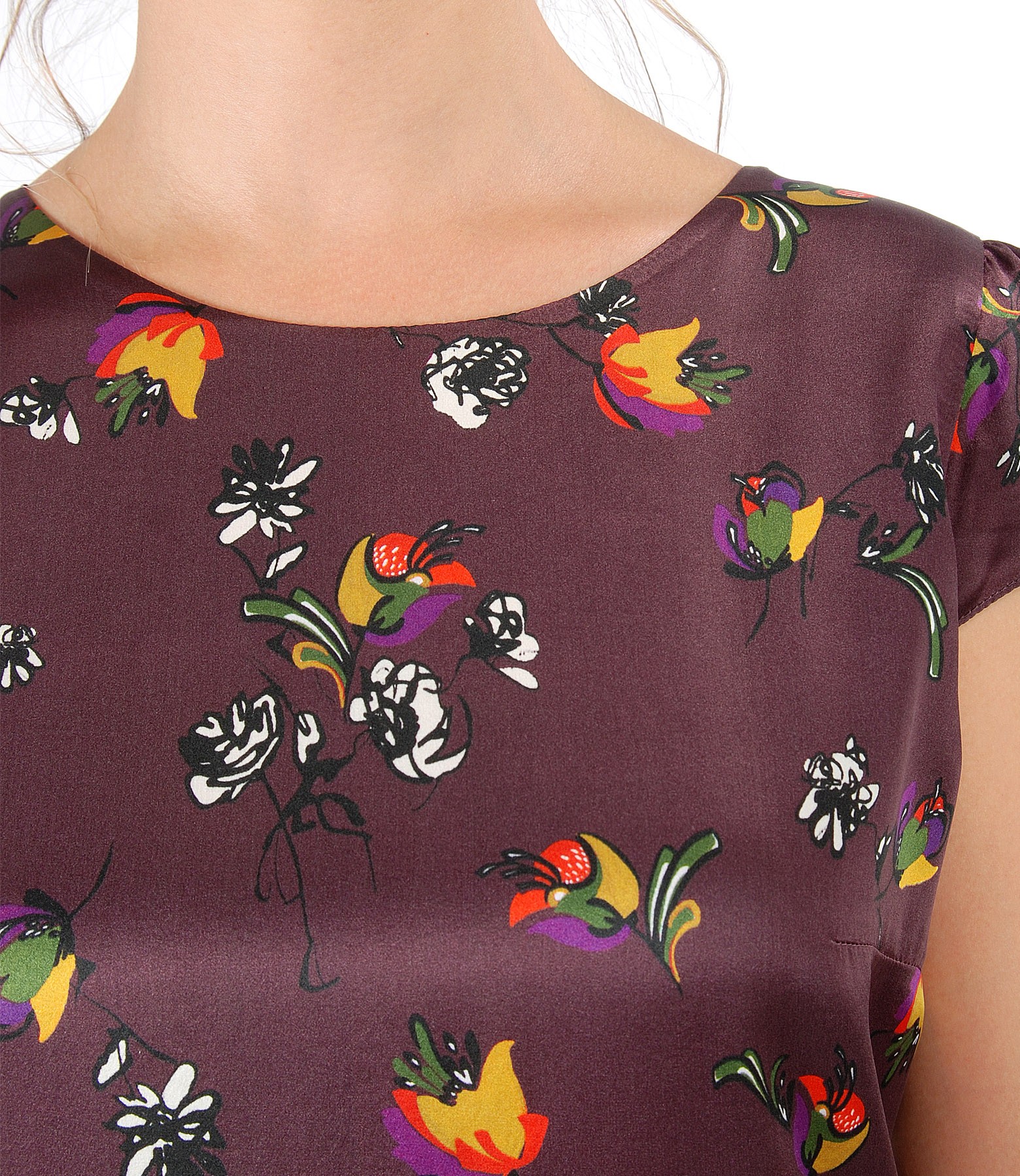 Rochie din matase imprimata cu motive florale, dublata cu viscoza, cu maneci scurte si decolteu rotund. Se inchide cu un nasture si cu fermoar pe mijloc spate.