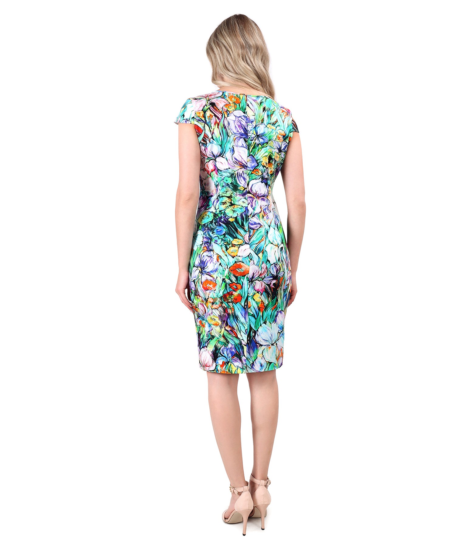Rochie din saten de bumbac elastic imprimat digital cu motive florale. Rochia este necaptusita, are slit pe fusta la spate si se inchide cu fermoar ascuns pe mijloc spate.