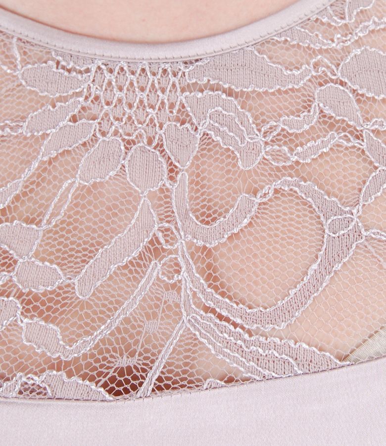 Rochie din saten elastic cu garnitura pe decolteu si maneci de dantela in ton. Se inchide cu fermoar ascuns pe lateral stanga.