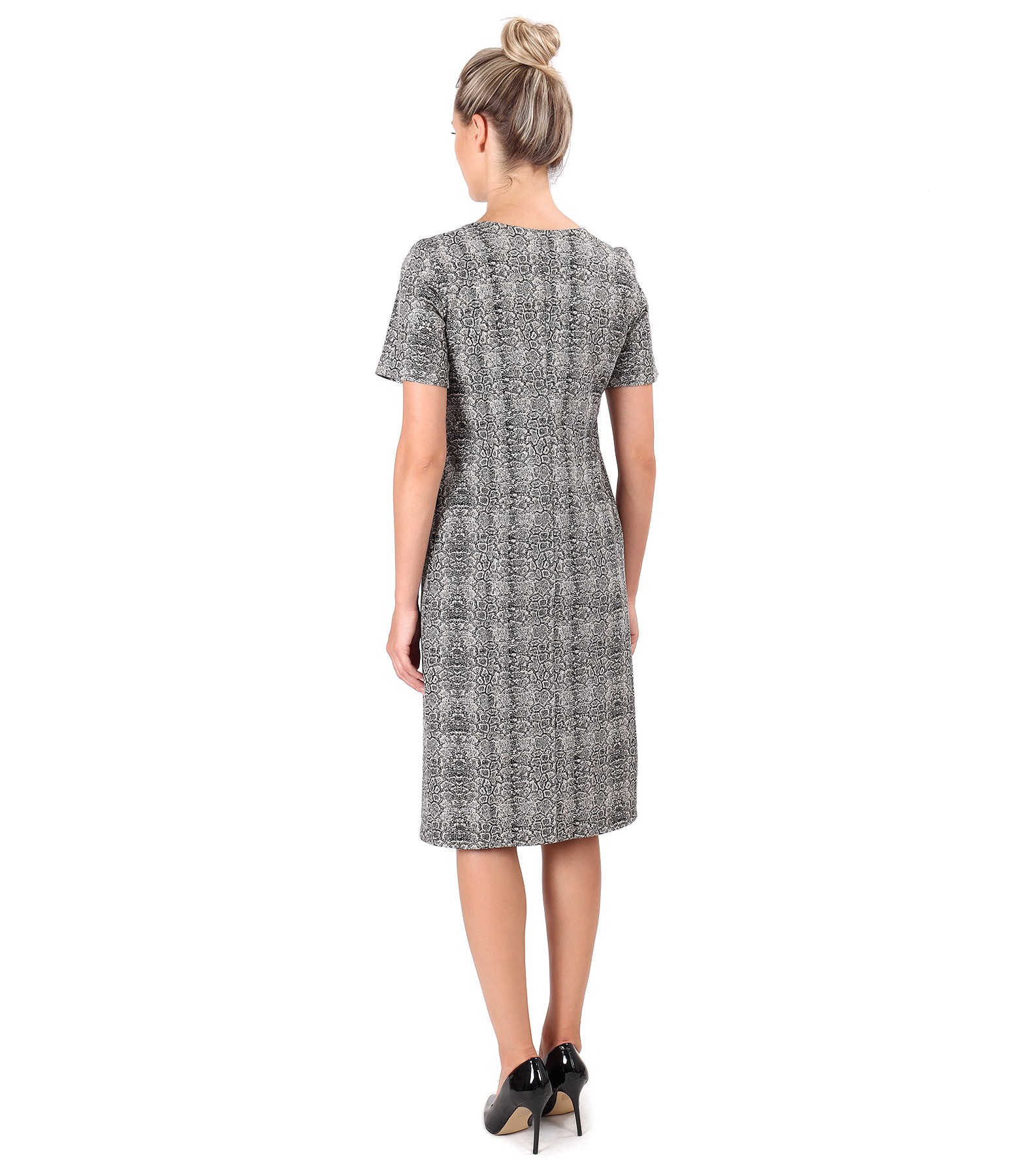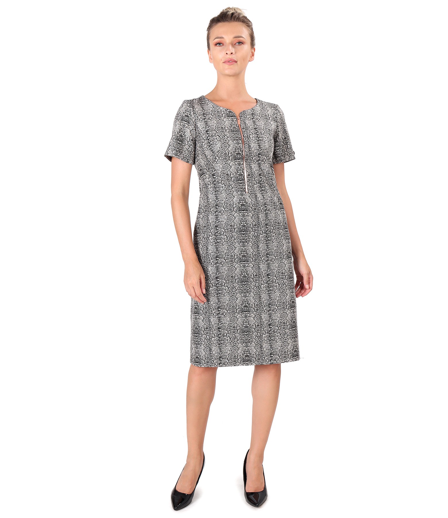 Rochie din stofa elastica cu animal print si fir de lurex, captusita, cu maneci scurte si cu fermoar cu cheie metalica pe mijloc fata.