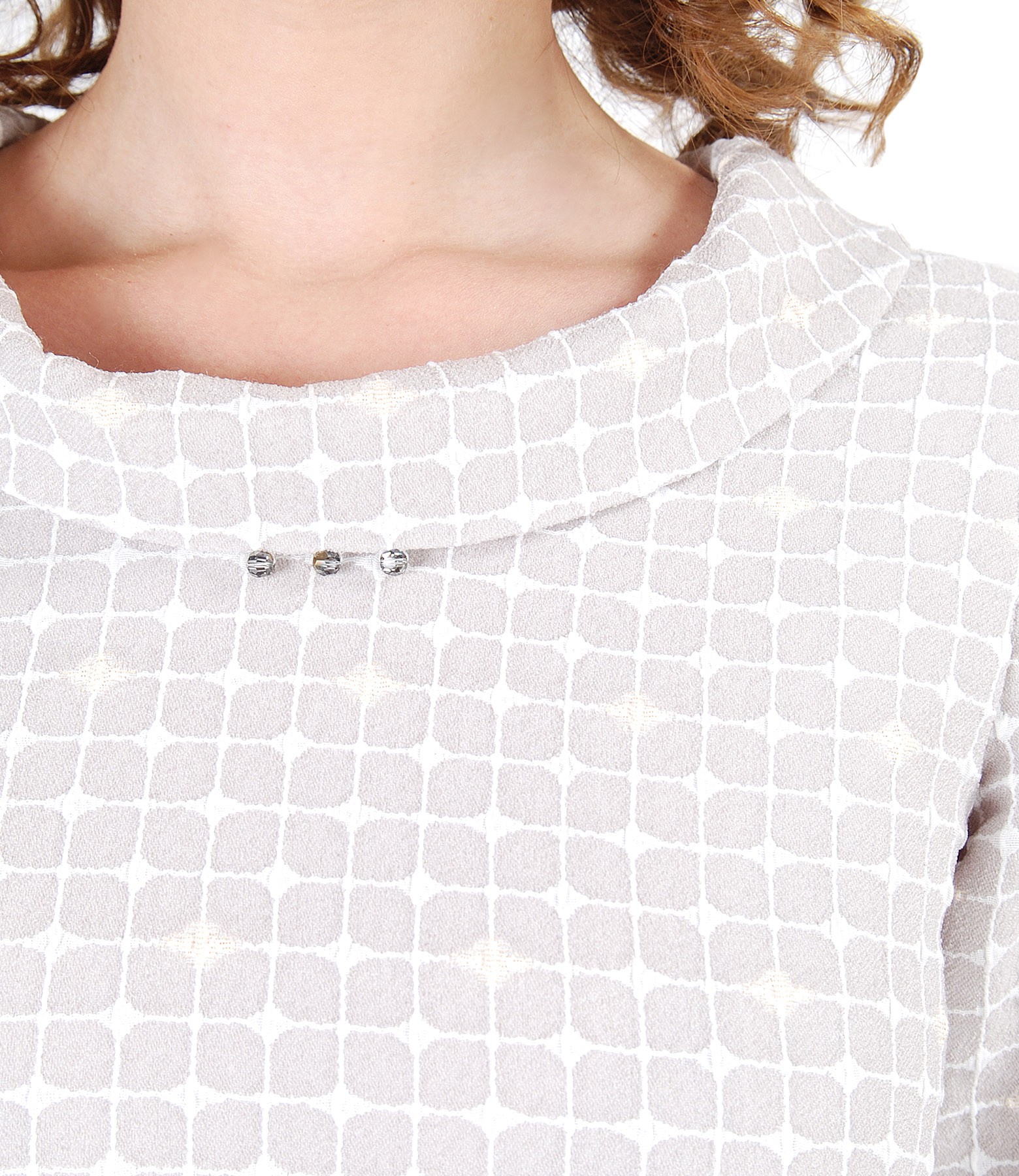 Rochie midi din stofa elastica, captusita, cu maneci 3/4, guler rotund si aplicatie de cristale pe guler. Se inchide cu fermoar ascuns pe mijloc spate.