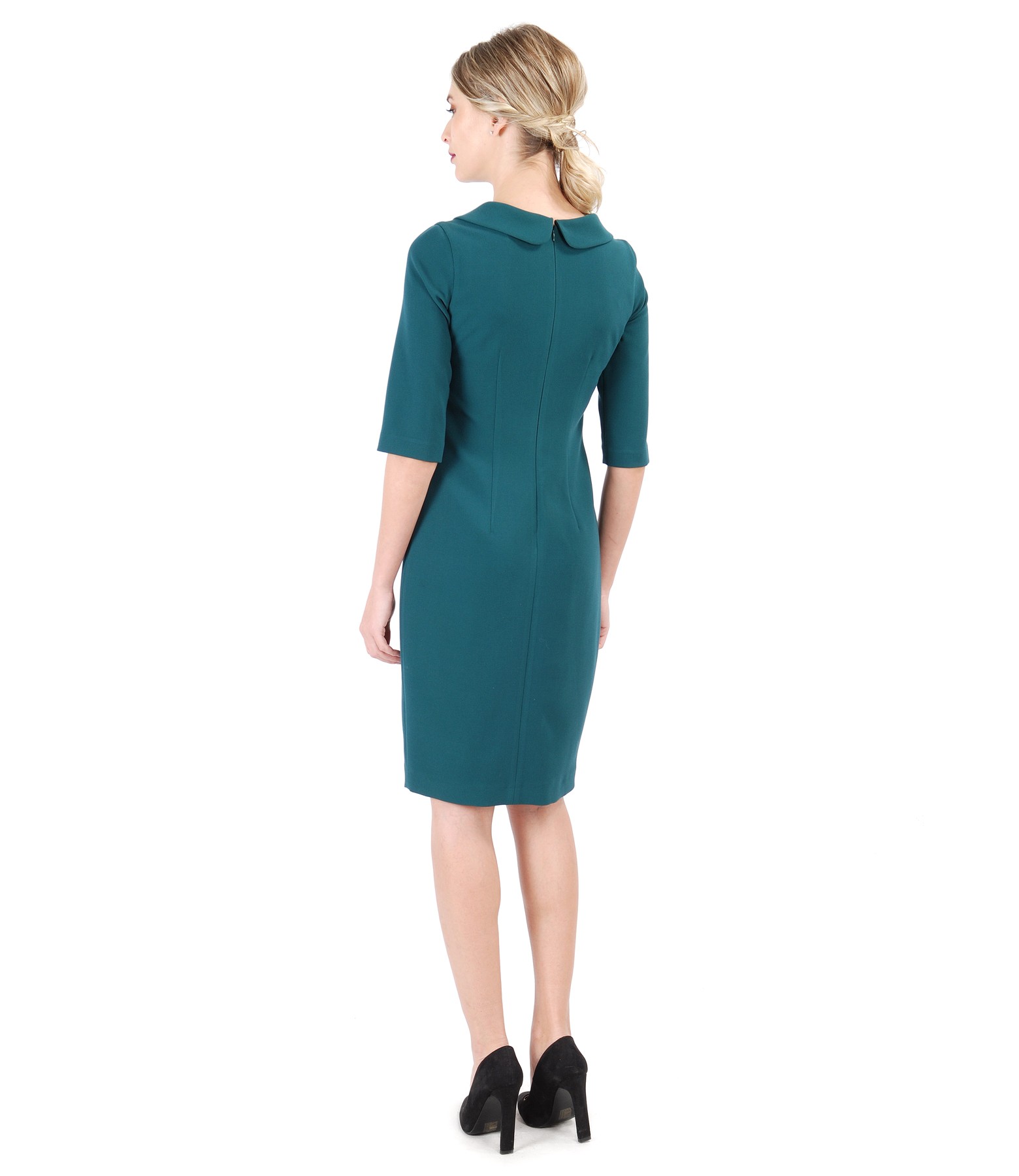 Rochie midi din stofa elastica, captusita, cu maneci 3/4, guler rotund si aplicatie de cristale la decolteu. Se inchide cu fermoar ascuns pe mijloc spate.